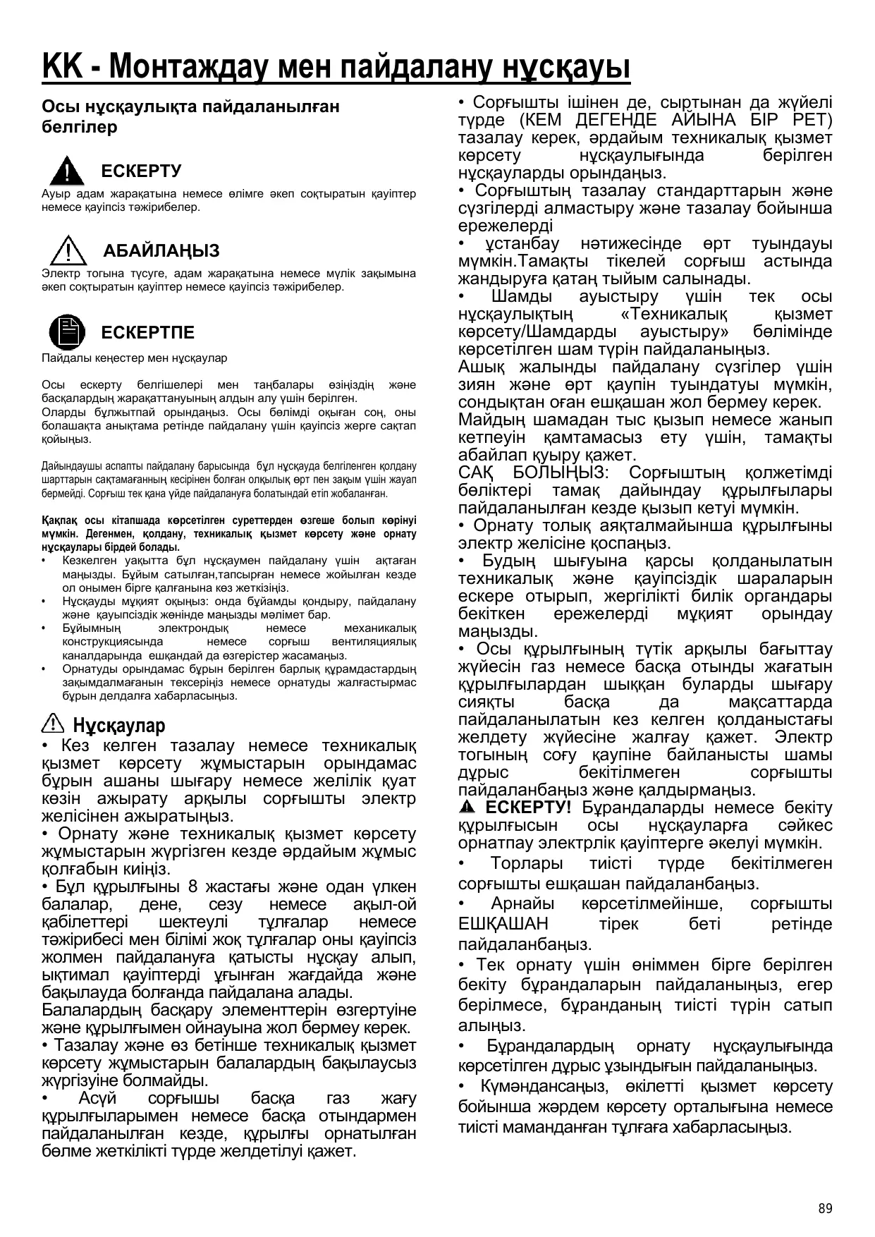 KK - Монтаждау мен пайдалану нұсқауы Осы нұсқаулықта пайдаланылған белгілер ЕСКЕРТУ Ауыр адам жарақатына немесе өлімге әкеп соқтыратын қауіптер немесе қауіпсіз тәжірибелер.