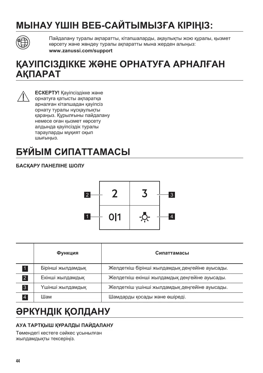 МЫНАУ ҮШІН ВЕБ-САЙТЫМЫЗҒА КІРІҢІЗ: Пайдалану туралы ақпаратты, кітапшаларды, ақаулықты жою құралы, қызмет көрсету және жөндеу туралы ақпаратты мына жерден алыңыз: www.zanussi.com/support
