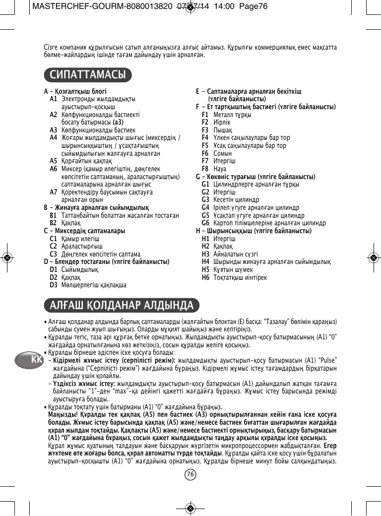 FR Selon la nature des aliments, le bol mixeur (D) vous permet de préparer jusqu’à 1.5 l de mélanges épais et 1.25 l de mélanges liquides. ACCESSOIRES UTILISES : - Bol mixeur (D). 2.1 - MONTAGE DES ACCESSOIRES • Amenez la tête multifonctions (A3) en position horizontale : appuyez sur le bouton (A2) et baissez manuellement la tête multifonctions (A3) jusqu’à ce qu’elle se verrouille (retour du bouton (A2) dans sa position initiale). • Déverrouillez la trappe de sécurité (A5) de la sortie rapide (A4) en la tournant dans le sens antihoraire puis ôtez-la. • Assurez-vous que l’appareil est bien à l’arrêt avant de verrouiller le bol mixeur (D). • Verrouillez le bol mixeur (D) sur la sortie (A4) en le tournant dans le sens horaire. • Mettez les aliments dans le bol mixeur, et verrouillez le couvercle (D2) muni du bouchon doseur (D3), en le tournant dans le sens antihoraire. 2.2 - MISE EN MARCHE • Démarrez en tournant le bouton variateur (A1) sur la position désirée (de V4 à Vmax ou pulse) selon la recette. Pour un meilleur contrôle du mixage et une meilleure homogénéisation de la préparation, utilisez la position «Pulse». Vous pouvez ajouter des aliments par l’orifice du bouchon doseur (D3) en cours de préparation. • Pour arrêter l’appareil, ramener le bouton (A1) sur « 0 ». - Temps maximum d'utilisation: 3 minutes. Conseils : Vous pouvez préparer : - des potages finement mixés, des veloutés, des compotes, des milk-shakes, des cocktails. - des pâtes légères (crêpes, beignets, clafoutis, far ...). - Lors du mixage, si les ingrédients restent collés aux parois du bol, arrêtez l’appareil, attendez l'arrêt complet de l'appareil et retirez le bol mixeur, faites tomber les ingrédients sur les lames à l'aide d'une spatule, puis repositionnez votre bol mixeur pour poursuivre votre préparation. • Ne remplissez jamais le bol mixeur avec un liquide bouillant. • N’utilisez pas le bol mixeur à vide. • Utilisez toujours le bol mixeur avec son couvercle. • N’enlevez jamais le couvercle avant l’arrêt complet de l’appareil. • Dans le bol mixeur, mettez toujours les ingrédients liquides avant les ingrédients solides. 2.3 - DEMONTAGE DE L’ACCESSOIRE • Attendez l’arrêt complet de l’appareil pour retirer le bol mixeur en le déverrouillant dans le sens antihoraire et remettez en place la trappe (A5) en la verrouillant sur la sortie (A4) (sens horaire).