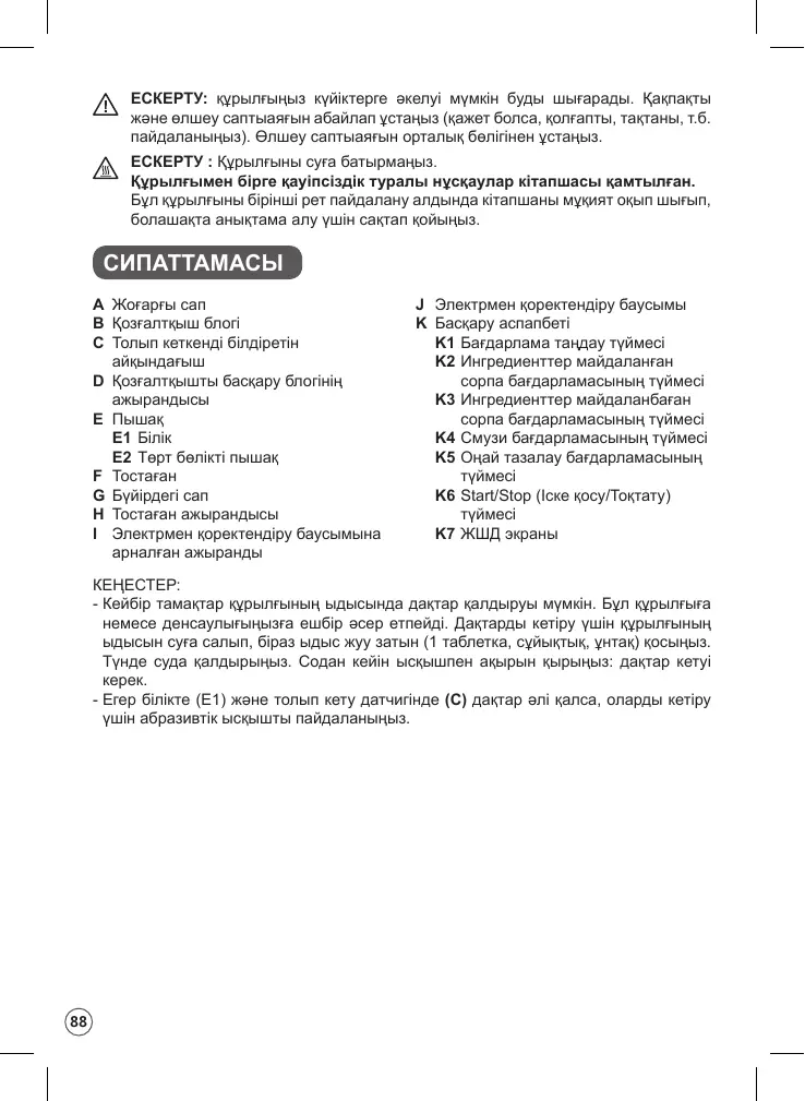 K1 Touche de sélection des programmes ––Si des résidus persistent sur l’entraîneur (E1) et sur le capteur de trop plein (C), utilisez une éponge abrasive pour les faire disparaître.