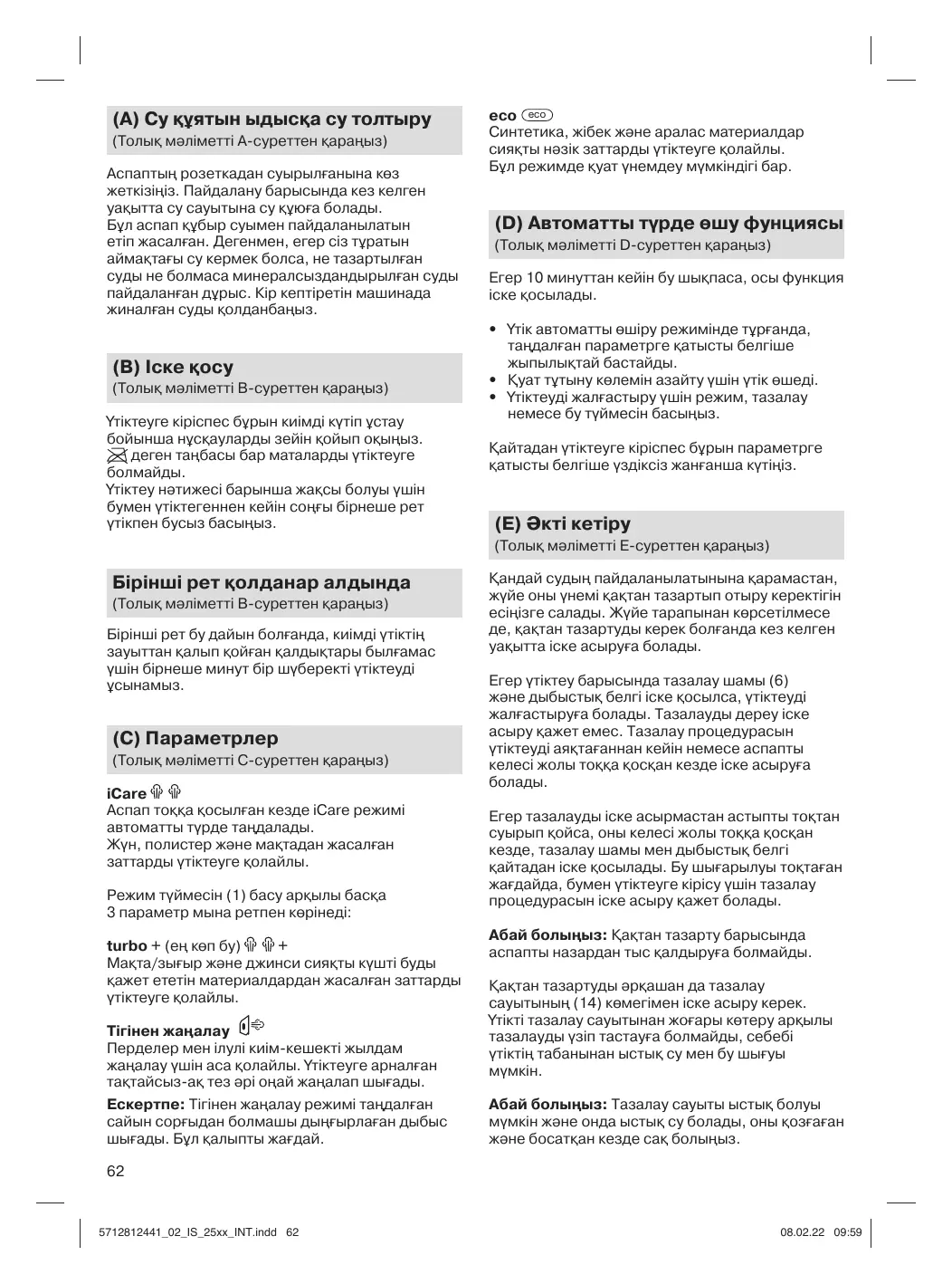 (Pour plus de détails, voir fig. B) Avant de commencer le repassage, respectez soigneusement les instructions figurant sur l’étiquette d’entretien du vêtement. Les tissus présentant ce symbole ne peuvent pas être repassés. Pour un meilleur résultat, après un repassage à la vapeur, terminez le repassage sans vapeur.