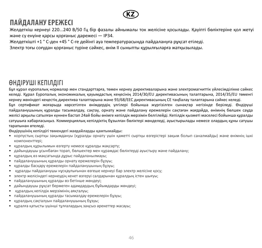 GARANTIES DU FABRICANT Ce Produit est conforme aux normes et standards européens, aux directives de la basse tension et de la compatibilité électromagnétique.