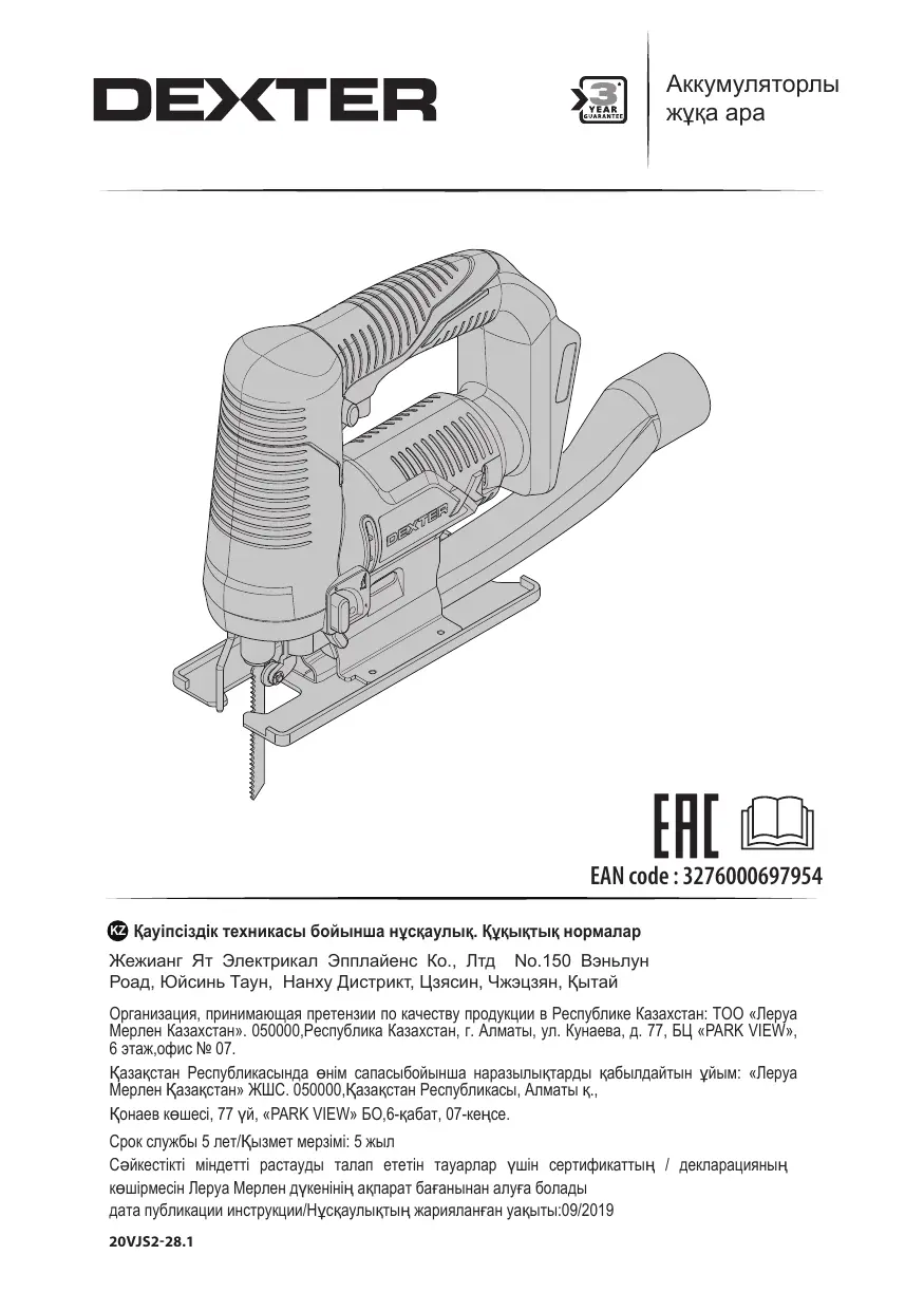 Téléchargez la notice de votre Сымсыз лобзик au format PDF gratuitement ! Retrouvez votre notice UP20 20 V - 20VJS2-28.1 - DEXTER et reprennez votre appareil électronique en main. Sur cette page sont publiés tous les documents nécessaires à l'utilisation de votre appareil UP20 20 V - 20VJS2-28.1 de la marque DEXTER.