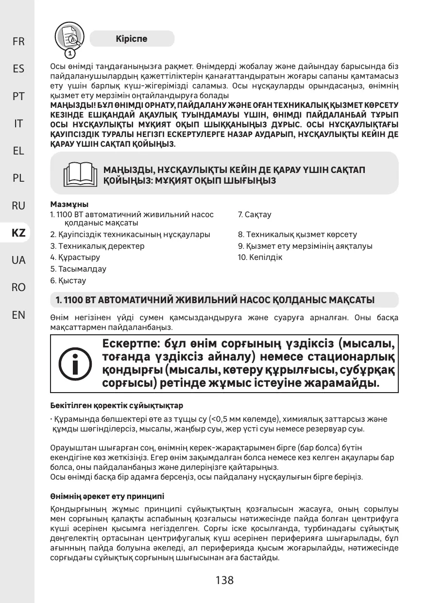 1. Utilisation prévue de la pompe d'alimentation automatique 1100W 7. Rangement (le cas échéant). Si le produit est endommagé ou présente un défaut, ne l'utilisez pas et retournez-le à votre revendeur.