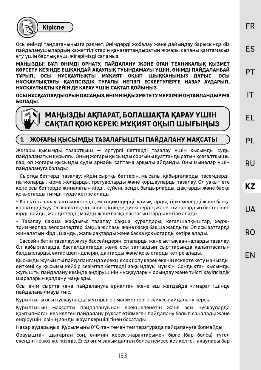 FN IMPORTANT - À CONSERVER POUR TOUTE REFERENCE ULTÉRIEURE : VEUILLEZ LIRE ATTENTIVEMENT Qi. UTILISATION PRÉVUE DU NETTOYEUR HAUTE PRESSION )