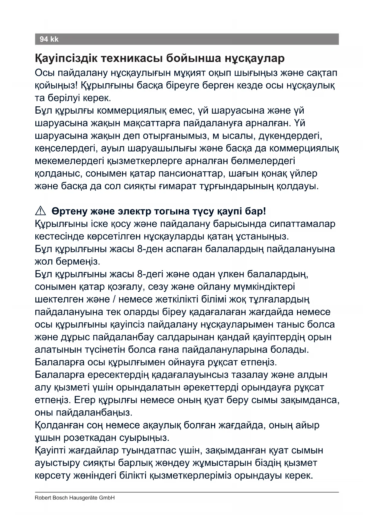 Тұншығу қаупі! Балаларға орам материалдарымен ойнауға рұқсат етпеңіз. Күйіп қалу қаупі! Теріңізге тигізіп алмаңыз.96 Robert Bosch Hausgeräte GmbH 96 kk Bosch құрылғысын сатып алғаныңызға рахмет! Бұл нұсқаулар құрамында осы өнімнің бірегей мүмкіндіктері туралы құнды ақпарат