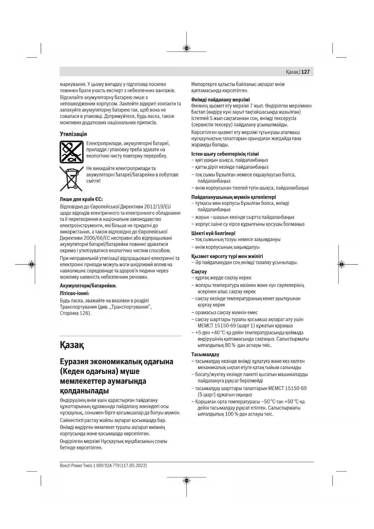– тасымалдау кезінде өнімді құлатуға және кез келген механикалық ықпал етуге қатаң тыйым салынады – босату/жүктеу кезінде пакетті қысатын машиналарды пайдалануға рұқсат берілмейді – тасымалдау шарттары талаптарын МЕМСТ15150-69 (5шарт) құжатын оқыңыз – Қоршаған орта температурасы −50°С-тан +50°С-қа дейін тасымалдау рұқсат етілген. Салыстырмалы ылғалдылық 100%-дан аспауы тиіс. Bosch Power Tools 1 609 92A 7T9 | (17.05.2022)128 | Қазақ Қауіпсіздік нұсқаулары Электр құралдары үшін жалпы қауіпсіздік