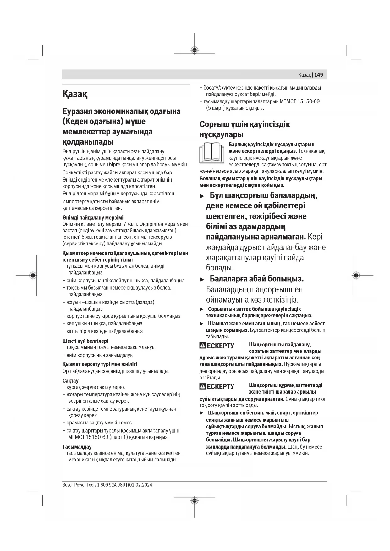 сұйықтықтар тұтануы немесе жарылуы мүмкін. Bosch Power Tools 1 609 92A 98U | (01.02.2024)150 | Қазақ