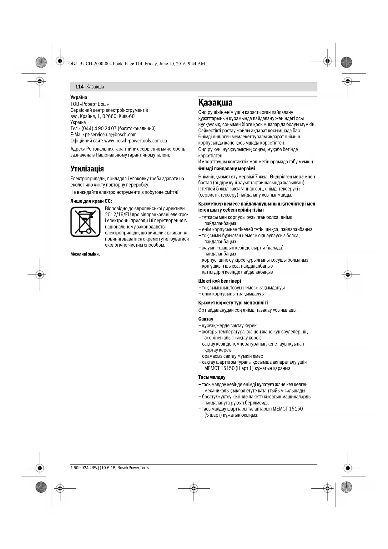 OBJ_BUCH-2000-004.book Page 115 Friday, June 10, 2016 9:44 AM116 | Қaзақша 1 609 92A 2BW | (10.6.16) Bosch Power Tools қалмауына, бөлшектердің ақаусыз немесе зақымдалмаған болуына, электр құралының зақымдалмағанына көз жеткізіңіз. Зақымдалған бөлшектері бар құралды пайдаланудан алдын жөндеңіз. Электр құралдарының дұрыс күтілмеуі жазатайым оқиғаларға себеп болып жатады. Кескіш аспаптарды өткір және таза күйде сақтаңыз. Дұрыс күтілген және кескіш жиектері өткір кескіш аспаптар аз кептеліп, кесілетін бетке оңай бағытталады. Электр құралын, жабдықтарды, алмалы-салмалы аспаптарды және т.б. осы нұсқауларға сай пайдаланыңыз. Сонымен жұмыс шарттарымен орындайтын әрекеттерге назар аударыңыз. Электр құралдарын арналмаған жұмыстарда пайдалану қауіпті.