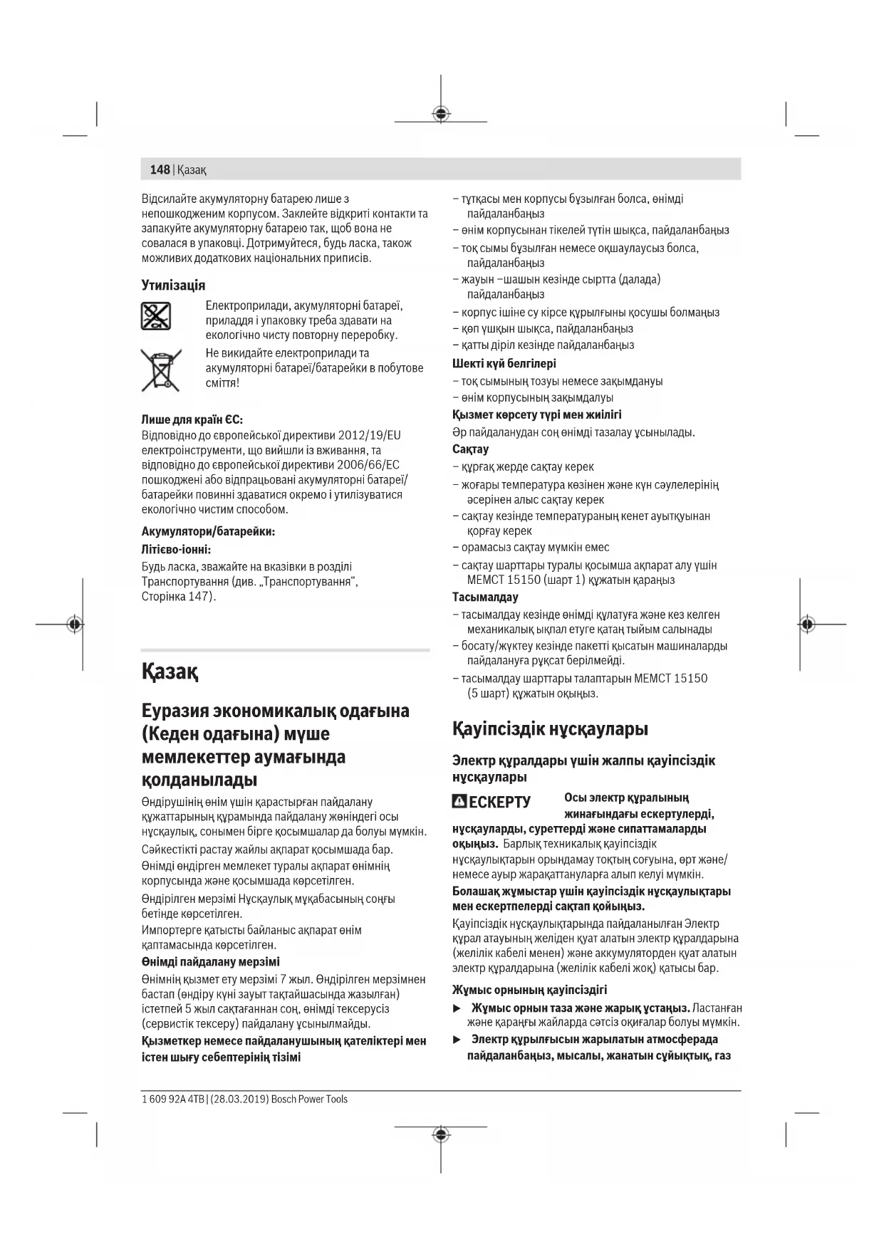 Жұмыс орнының қауіпсіздігі u Жұмыс орнын таза және жарық ұстаңыз. Ластанған және қараңғы жайларда сәтсіз оқиғалар болуы мүмкін. u Электр құрылғысын жарылатын атмосферада пайдаланбаңыз, мысалы, жанатын сұйықтық, газ 1 609 92A 4TB | (28.03.2019) Bosch Power ToolsҚазақ | 149