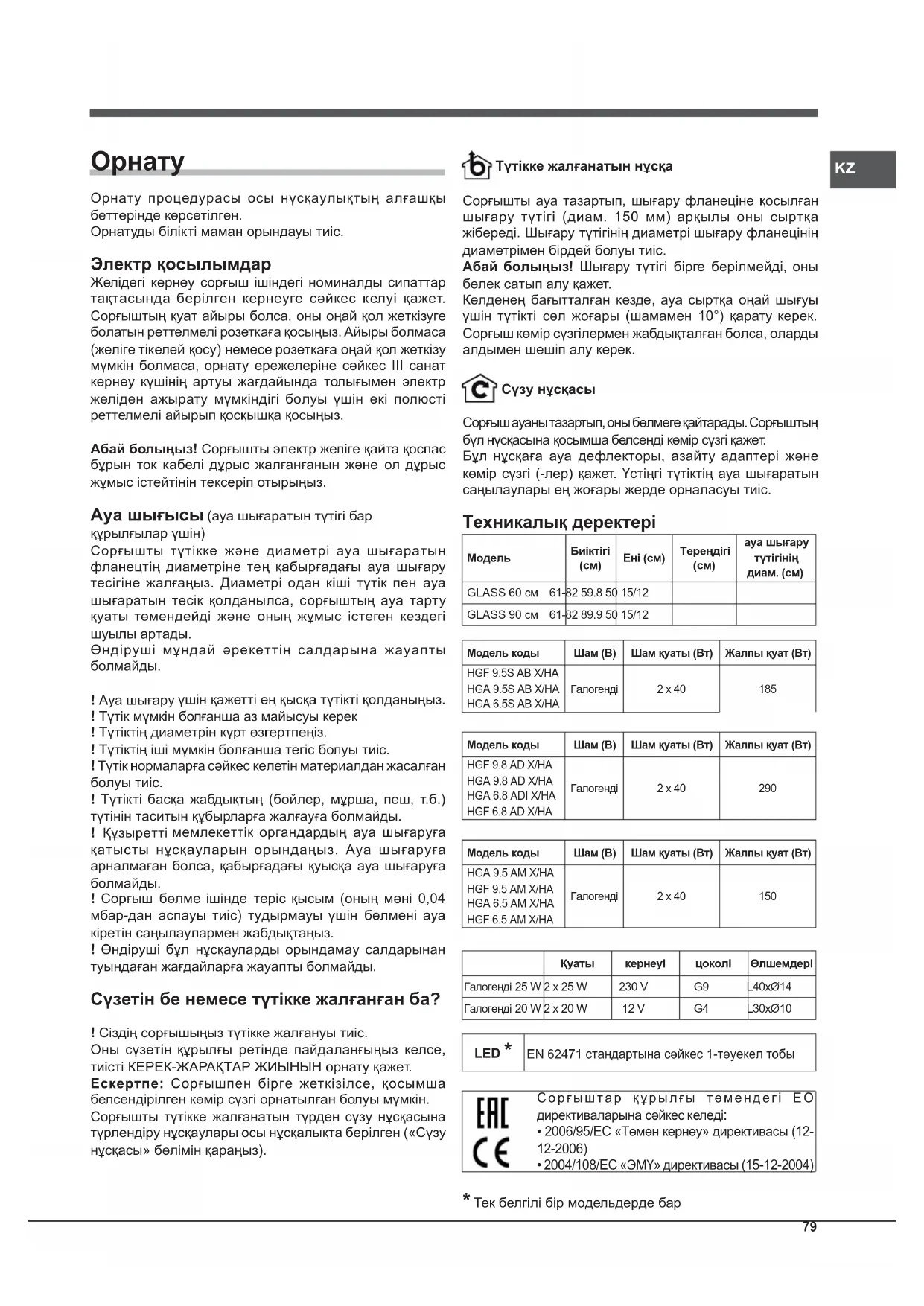 Сорғыш көмір сүзгілермен жабдықталған болса, оларды алдымен шешіп алу керек. Сүзу нұсқасы Сорғыш ауаны тазартып, оны бөлмеге қайтарады. Сорғыштың бұл нұсқасына қосымша белсенді көмір сүзгі қажет. Бұл нұсқаға ауа дефлекторы, азайту адаптері жəне көмір сүзгі (-лер) қажет. Үстіңгі түтіктің ауа шығаратын саңылаулары ең жоғары жерде орналасуы тиіс. Техникалық деректері МодельБиіктігі (см)Ені (см)Тереңдігі (см)ауа шығару түтігінің диам. (см)GLASS 60 см 61-82 59.8 50 15/12GLASS 90 см 61-82 89.9 50 15/12 Модель коды Шам (В) Шам қуаты (Вт) Жалпы қуат (Вт) HGF 9.5S AB X/HAHGA 9.5S AB X/HAHGA 6.5S AB X/HAГалогенді 2 x 40 185 Модель коды Шам (В) Шам қуаты (Вт) Жалпы қуат (Вт) HGF 9.8 AD X/HAHGA 9.8 AD X/HAHGA 6.8 ADI X/HAHGF 6.8 AD X/HAГалогенді 2 x 40 290 Модель коды Шам (В) Шам қуаты (Вт) Жалпы қуат (Вт) HGA 9.5 AM X/HAHGF 9.5 AM X/HAHGA 6.5 AM X/HAHGF 6.5 AM X/HAГалогенді 2 x 40 150Қуаты кернеуі цоколі ӨлшемдеріГалогенді 25 W 2 x 25 W 230 V G9 L40xØ14Галогенді 20 W 2 x 20 W 12 V G4 L30xØ10LED * EN 62471 стандартына сəйкес 1-тəуекел тобы Сорғыштар құрылғы төмендегі ЕО директиваларына сəйкес келеді: