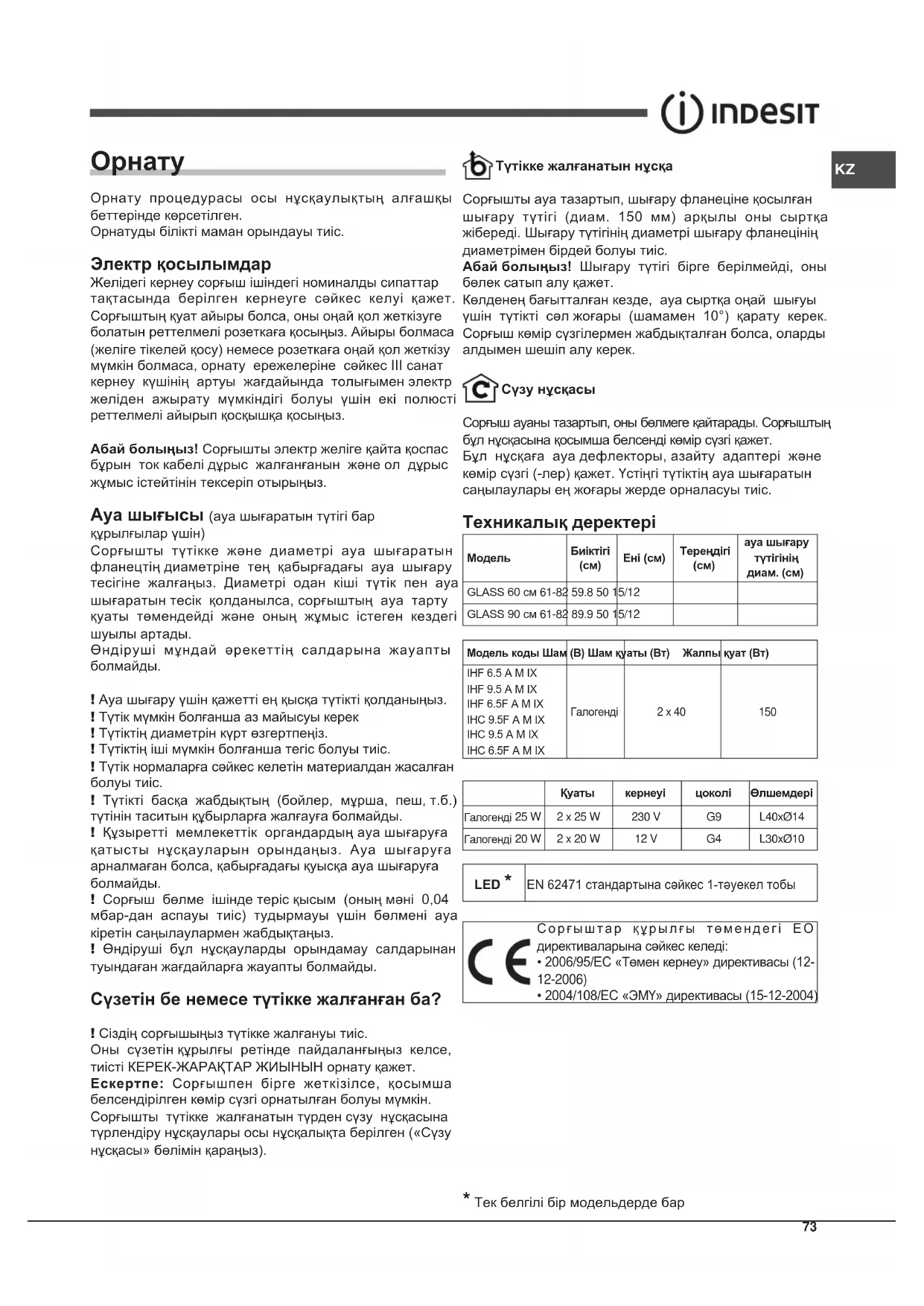 Техникалық деректері МодельБиіктігі (см) Ені (см)Тереңдігі (см) ауа шығару түтігінің диам. (см)GLASS 60 см 61-82 59.8 50 15/12GLASS 90 см 61-82 89.9 50 15/12Модель коды Шам (В) Шам қуаты (Вт) Жалпы қуат (Вт)IHF 6.5 A M IXIHF 9.5 A M IXIHF 6.5F A M IXIHC 9.5F A M IXIHC 9.5 A M IXIHC 6.5F A M IX Галогенді 2 x 40 150 Қуаты кернеуі цоколі ӨлшемдеріГалогенді 25 W 2 x 25 W 230 V G9 L40xØ14 Галогенді 20 W 2 x 20 W 12 V G4 L30xØ10 LED *EN 62471 стандартына сәйкес 1-тәуекел тобы Сорғыштар құрылғы төмендегі ЕО