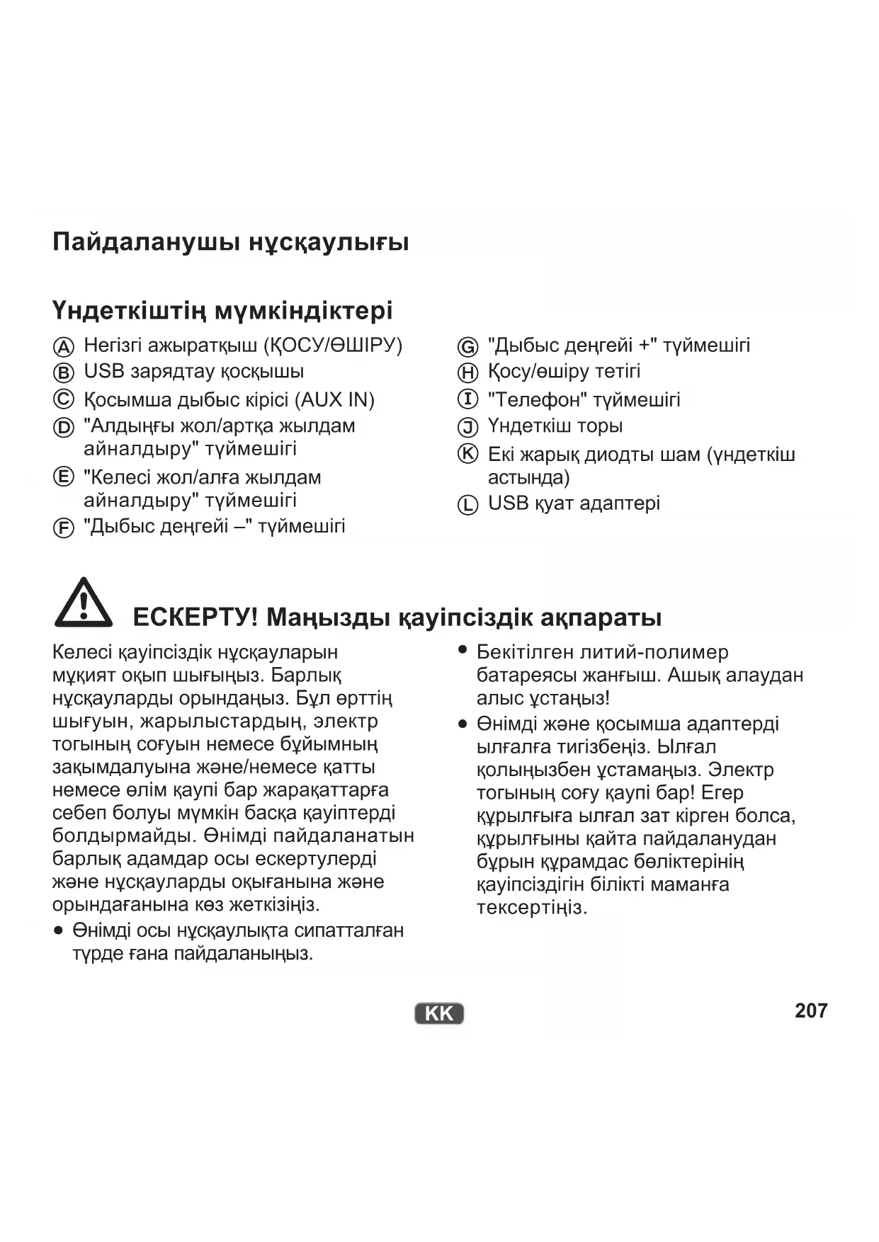 тетігін қуаттың өшірілу дыбысы естілгенге дейін басып тұрыңыз. Ескерім: Bluetooth арқылы жұптастырылған құрылғы қолдау көрсетілген протоколдарға сәйкес жұмыс істейді. Мысалы, смартфондар, әдетте HFP (Hands-free prole) және A2DP (Advanced Audio Distribution Prole) протоколын пайдаланады. Сондықтан, бұл жағдайда үндеткіш қоңырауларды да және дыбыстың шығуын да басқарады. A2DP протоколы ғана бар MP3 ойнатқыш тек дыбыс шығарады және қарапайым ұялы телефонмен тек қоңыраулар қабылданады.211