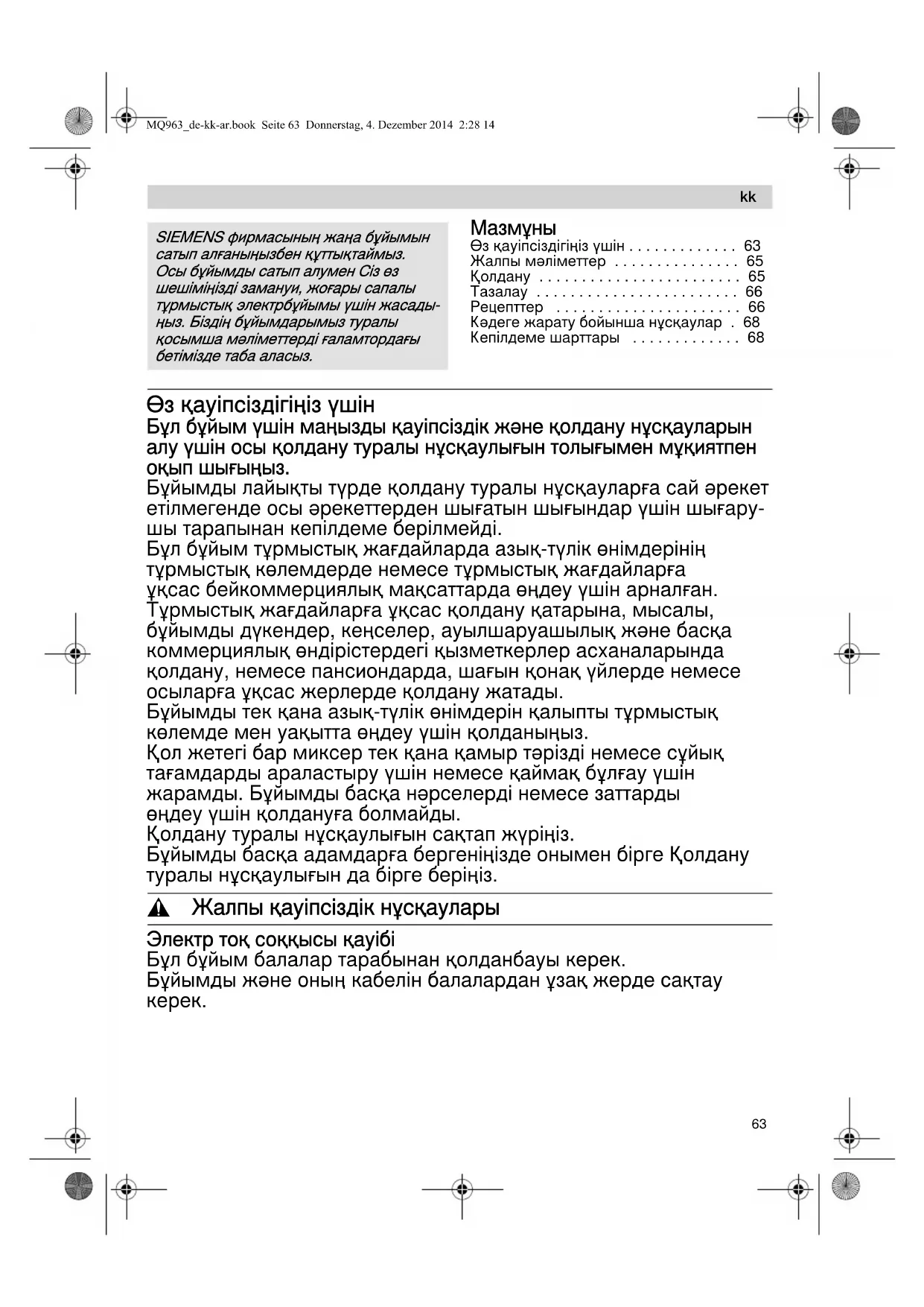 Мазмұны Өз қауіпсіздігіңіз үшін . . . . . . . . . . . . . 63Жалпы мәліметтер . . . . . . . . . . . . . . . 65Қолдану . . . . . . . . . . . . . . . . . . . . . . . . 65Тазалау . . . . . . . . . . . . . . . . . . . . . . . . 66Рецепттер . . . . . . . . . . . . . . . . . . . . . . 66Кәдеге жарату бойынша нұсқаулар . 68Кепілдеме шарттары . . . . . . . . . . . . . 68 Өз қауіпсіздігіңіз үшін