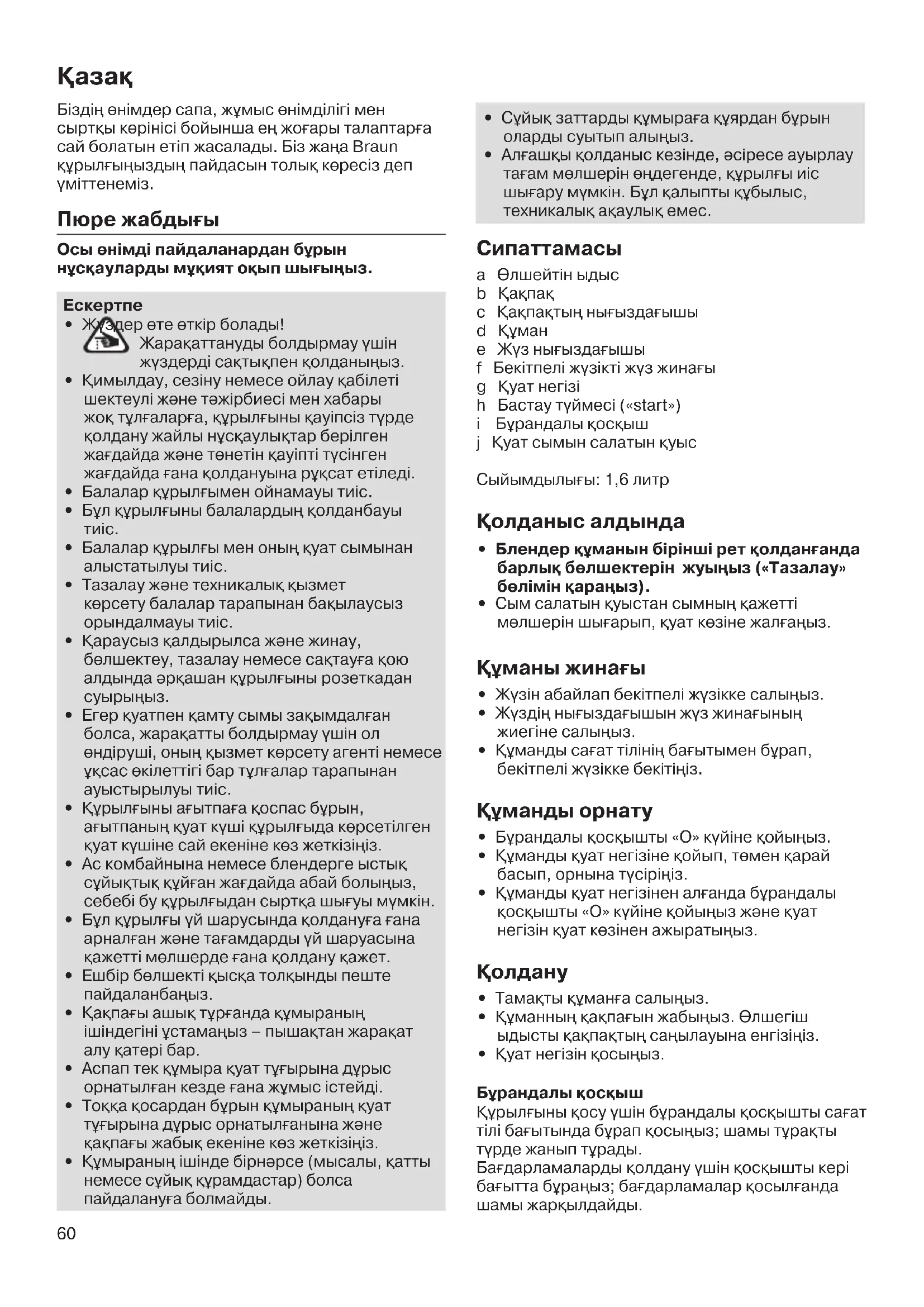 Негізді суÊа малмаºыз. Дымыл матамен сËртіп алыºыз. ман жина}ын жылдам тазалау/шаю Áманды босатып, ішіне су Áйыºыз. уат неізіне ойып, бÁрандалы осышты «» баÊытында бірнеше рет бÁраºыз. Áманды босатып, жасылап шайыºыз. Блшектенген манды мият тазалау Бекіту жËзігін (f) босатарда Áманныº бос болуын адаÊалаºыз. ЖËзін абайлап Áстаºыз. Алынбалы б¼лшектерініº барлыÊын ыдыс жуатын машинамен жууÊа болады. апаÊы дÁрыс жуылу Ëшін ныÊыздаÊышын (c) алып жуыºыз. Ескертусіз ¼згертілуге жатады. KÁрылÊыныº ызмет мерзімі аяталÊанда, оны тÁрмысты алдытармен бірге таста- маºыз. ÁрылÊыны Braun компаниясыныº сервис орталыÊына немесе ¼з еліºіздегі тиісті жинау орындарына апару арылы арылыºыз.62 Шы}арыл}ан жылы ШыÊарылÊан жылын белгілеу Ëшін бÁйым таташасындаÊы 5-санды шыÊарушы кодын араºыз. ШыÊарушы кодыныº бірінші саны шыÊарÊан жылдыº соºÊы санын білдіреді. Келесі 2 сандар шыÊарылÊан жылдыº кËнтізбелік апта санын білдіреді. Ал соºÊы 2 сандар 1992 жылдан бастап автоматты тËрде есептелген басып шыÊару мерзімін білдіреді. Мысалы: 30421 – БÁйым 2013 жылыныº 4 аптасында шыÊарылÊан. Áмыралы блендер, JB 5160, Jug Blender Тип 4126 220–240 Кернеу, 50–60 Гц, 1000 Ватт ытайда жасалÊан Ëшін Делонги Браун Хаусхолд ГмбХ Германия Заºды ¼ндіруші: Делонги Браун Хаусхолд ГмбХ Карл-Улрих-Штрассе º 63263 Ной-Изенбург Кепілді ызмет к¼рсету мерзімінде немесе одан кейін ызмет к¼рсету, сондай-а ааулытарды анытау мÍселелері бойынша Braun компаниясыныº ТÁтынушыларÊа ызмет к¼рсету ызметіне 8 800 200 5262 телефоны арылы хабарласыºыз. БÁйымды іске пайдалану нÁсаулыÊына сÍйкес ¼з масатында пайдалану керек. БÁйымныº ызмет мерзімі тÁтынушыÊа сатылÊан кËннен бастап 2 жылды Áрайды.
