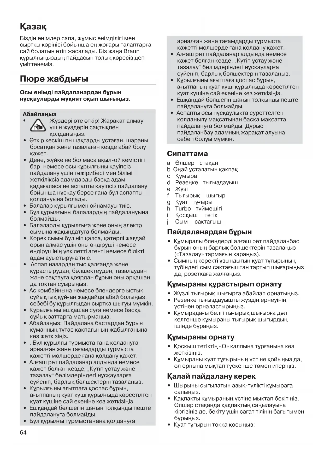 - Ас комбайнына немесе блендерге ысты с·йыты ·й¿ан жа¿дайда абай болы°ыз, себебі бу ·рыл¿ыдан сырта шы¿уы мÀмкін.