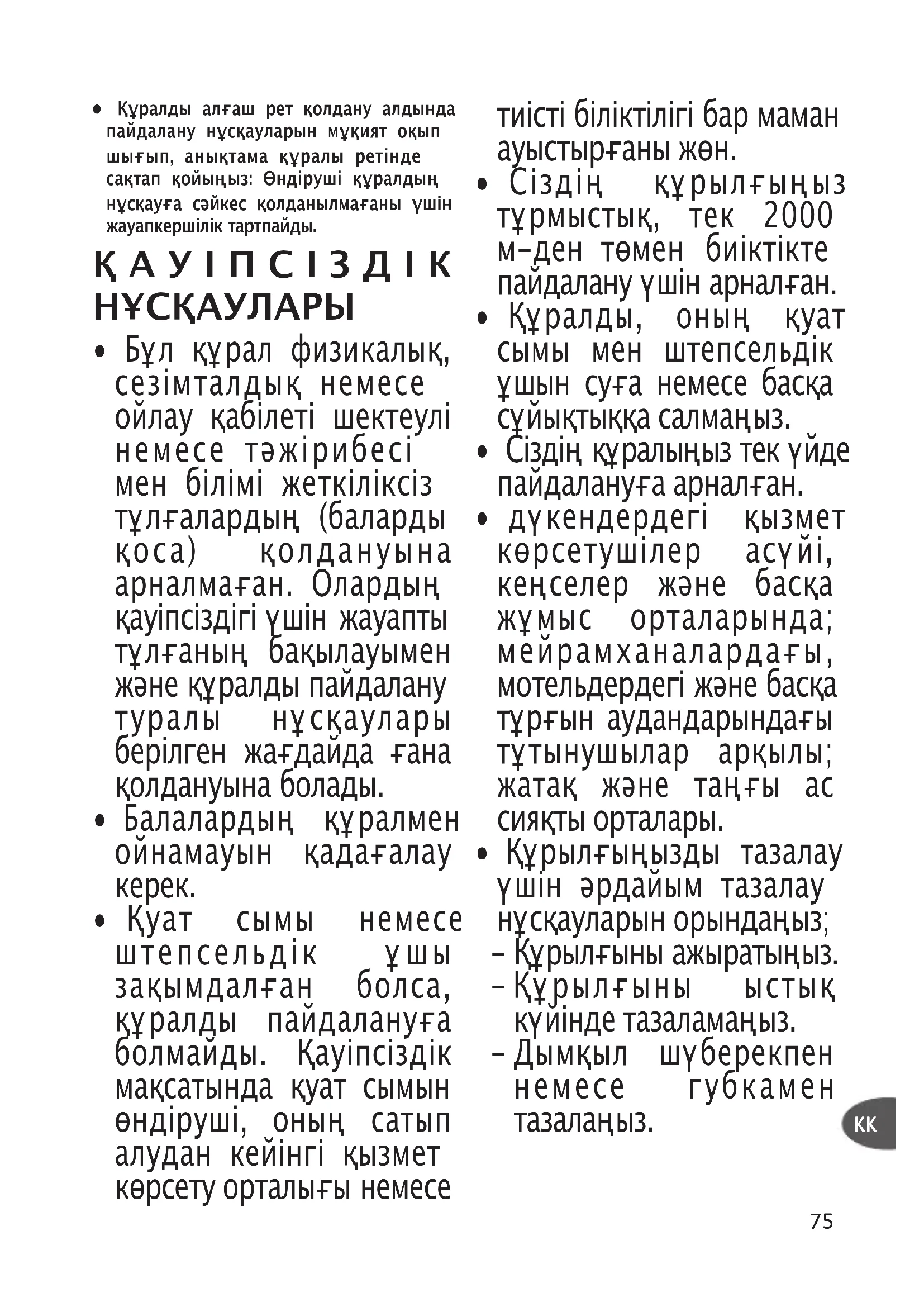 - Бұл құрал физикалық, сезімталдық немесе ойлау қабілеті шектеулі немесе тәжірибесі мен білімі жеткіліксіз тұлғалардың (баларды қоса) қолдануына арналмаған. Олардың қауіпсіздігі үшін жауапты тұлғаның бақылауымен және құралды пайдалану туралы нұсқаулары берілген жағдайда ғана қолдануына болады.