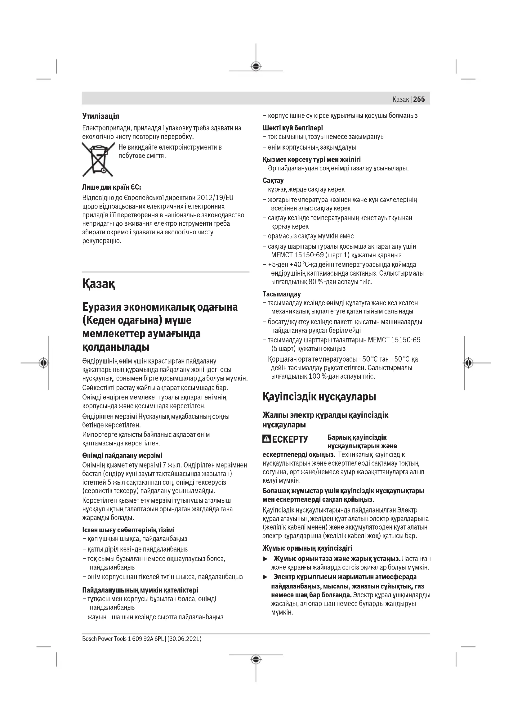 Bosch Power Tools 1 609 92A 6PL | (30.06.2021)256 | Қазақ u Балалар мен бақылаушыларды электр құралынан алыс ұстаңыз. Алданулар бақылау жоғалуына алып келуі мүмкін. u Жабдық тұрмыстық жағдайларда, коммерциялық аймақтарда және қоғамдық жерлерде, зиянды және қауіпті өндірістік факторлар жоқ кіші электр тұтынуы бар өндірістік аймақтарында жұмыс істеу үшін