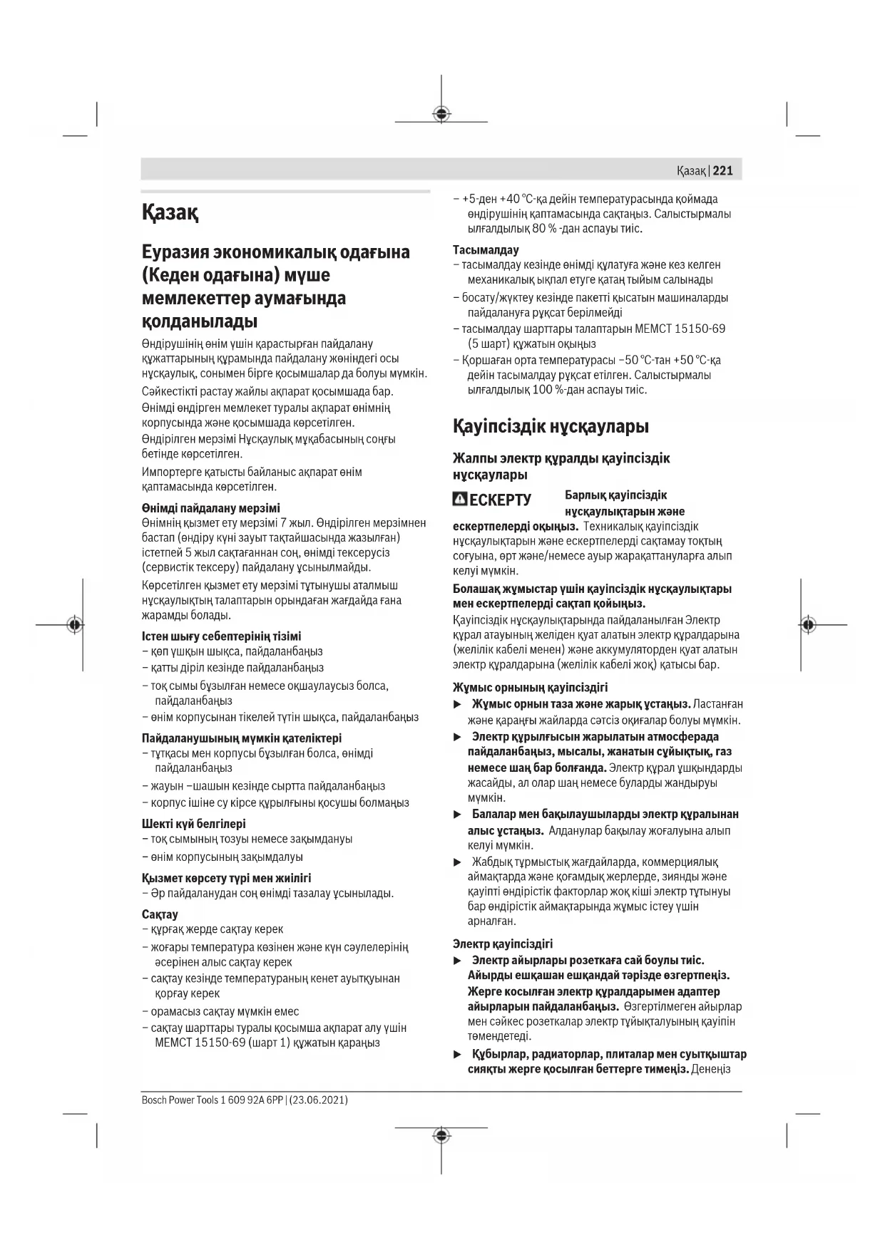 Электр қауіпсіздігі u Электр айырлары розеткаға сай боулы тиіс. Айырды ешқашан ешқандай тәрізде өзгертпеңіз. Жерге косылған электр құралдарымен адаптер айырларын пайдаланбаңыз. Өзгертілмеген айырлар мен сәйкес розеткалар электр тұйықталуының қауіпін төмендетеді. u Құбырлар, радиаторлар, плиталар мен суытқыштар сияқты жерге қосылған беттерге тимеңіз. Денеңіз Bosch Power Tools 1 609 92A 6PP | (23.06.2021)222 | Қазақ жерге қосылған болса жоғары тоқ соғу қауіпі пайда