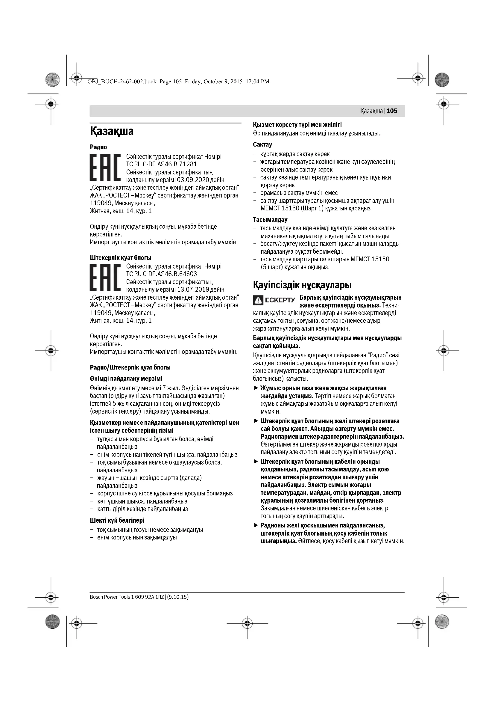 –тасымалдау кезінде өнімді құлатуға және кез келген механикалық ықпал етуге қатаң тыйым салынады – босату/жүктеу кезінде пакетті қысатын машиналарды пайдалануға рұқсат берілмейді. –тасымалдау шарттары талаптарын МЕМСТ 15150 (5 шарт) құжатын оқыңыз. Қауіпсіздік нұсқаулары Барлық қауіпсіздік нұсқаулықтарын және ескертпелерді оқыңыз. Техни- калық қауіпсіздік нұсқаулықтарын және ескертпелерді сақтамау тоқтың соғуына, өрт және/немесе ауыр жарақаттануларға алып келуі мүмкін. Барлық қауіпсіздік нұсқаулықтары мен нұсқауларды сақтап қойыңыз. Қауіпсіздік нұсқаулықтарында пайдаланған “Радио” сөзі желіден істейтін радиоларға (штекерлік қуат блогымен)