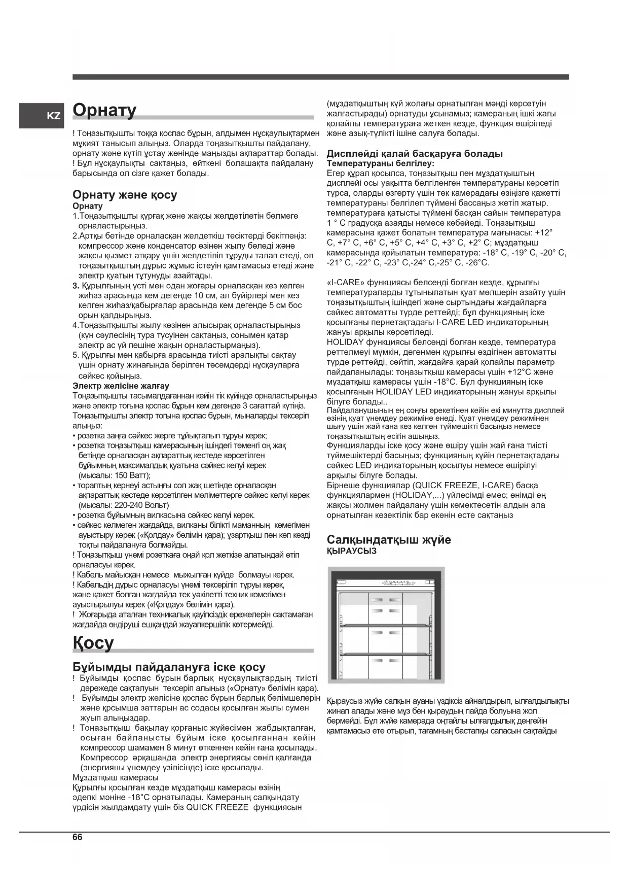 Бұйымды пайдалануға іске қосу ! Бұйымды қоспас бұрын барлық нұсқаулықтардың тиісті дәрежеде сақталуын тексеріп алыңыз («Орнату» бөлімін қара). ! Бұйымды электр желісіне қоспас бұрын барлық бөлімшелерін және қрсымша заттарын ас содасы қосылған жылы сумен жуып алыңыздар. ! Тоңазытқыш бақылау қорғаныс жүйесімен жабдықталған, осыған байланысты бұйым іске қосылғаннан кейін компрессор шамамен 8 минут өткеннен кейін ғана қосылады. Компрессор әрқашанда электр энергиясы сөніп қалғанда (энергияны үнемдеу үзілісінде) іске қосылады. Мұздатқыш камерасы Құрылғы қосылған кезде мұздатқыш камерасы өзінің әдепкі мәніне -18°C орнатылады. Камераның салқындату үрдісін жылдамдату үшін біз QUICK FREEZE функциясын (мұздатқыштың күй жолағы орнатылған мәнді көрсетуін жалғастырады) орнатуды ұсынамыз; камераның ішкі жағы қолайлы температураға жеткен кезде, функция өшіріледі және азық-түлікті ішіне салуға болады. Дисплейді қалай басқаруға болады Температураны белгілеу: Егер құрал қосылса, тоңазытқыш пен мұздатқыштың дисплейі осы уақытта белгіленген температураны көрсетіп тұрса, оларды өзгерту үшін тек камерадағы өзіңізге қажетті температураны белгілеп түймені бассаңыз жетіп жатыр. температураға қатысты түймені басқан сайын температура 1 ° С градусқа азаяды немесе көбейеді. Тоңазытқыш камерасына қажет болатын температура мағынасы: +12° С, +7° С, +6° С, +5° С, +4° С, +3° С, +2° С; мұздатқыш камерасында қойылатын температура: -18° С, -19° С, -20° С, -21° С, -22° С, -23° С,-24° С,-25° С, -26°С. «I-CARE» функциясы белсенді болған кезде, құрылғы температураларды тұтынылатын қуат мөлшерін азайту үшін тоңазытқыштың ішіндегі және сыртындағы жағдайларға сәйкес автоматты түрде реттейді; бұл функцияның іске қосылғаны пернетақтадағы I-CARE LED индикаторының жануы арқылы көрсетіледі. HOLIDAY функциясы белсенді болған кезде, температура реттелмеуі мүмкін, дегенмен құрылғы өздігінен автоматты түрде реттейді, сөйтіп, жағдайға қарай қолайлы параметр пайдаланылады: тоңазытқыш камерасы үшін +12°C және мұздатқыш камерасы үшін -18°C. Бұл функцияның іске қосылғанын HOLIDAY LED индикаторының жануы арқылы білуге болады.. Пайдаланушының ең соңғы әрекетінен кейін екі минутта дисплей өзінің қуат үнемдеу режиміне енеді. Қуат үнемдеу режимінен шығу үшін жай ғана кез келген түймешікті басыңыз немесе тоңазытқыштың есігін ашыңыз. Функцияларды іске қосу және өшіру үшін жай ғана тиісті түймешіктерді басыңыз; функцияның күйін пернетақтадағы сәйкес LED индикаторының қосылуы немесе өшірілуі арқылы білуге болады. Бірнеше функциялар (QUICK FREEZE, I-CARE) басқа функциялармен (HOLIDAY,...) үйлесімді емес; өнімді ең жақсы жолмен пайдалану үшін көмектесетін алдын ала орнатылған кезектілік бар екенін есте сақтаңыз Салқындатқыш жүйе