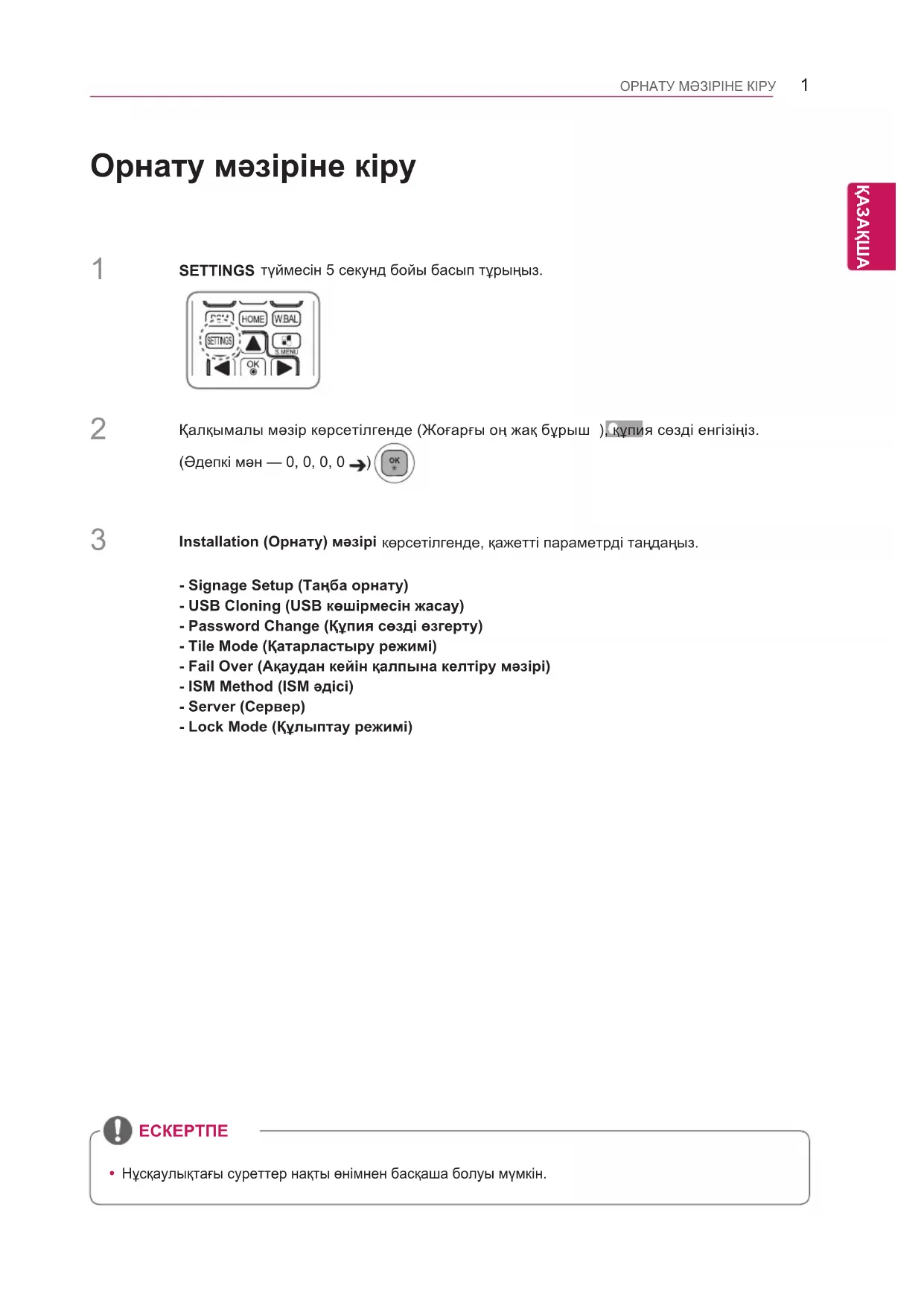ОРНАТУ МӘЗІРІНЕ КІРУ Орнату мәзіріне кіру Installation )Орнату( мәзірі көрсетілгенде, қажетті параметрді таңдаңыз.Қалқымалы мәзір көрсетілгенде )Жоғарғы оң жақ бұрыш (, құпия сөзді енгізіңіз. )Әдепкі мән — 0, 0, 0, 0 )SETTINGS түймесін 5 секунд бойы басып тұрыңыз.