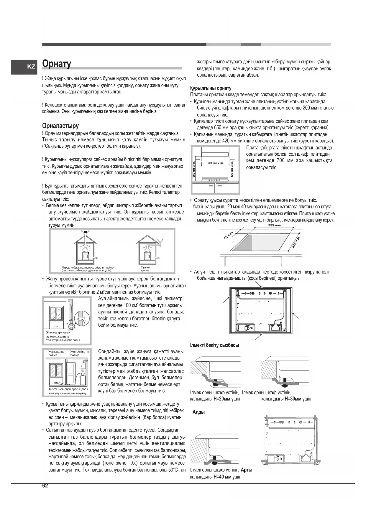 - Газ құрылғылары дұрыс қызмет атқару үшін ауа айналымын ретке келтіру керек. Осы қондырғыларды орнатқан кезде “Орналастыру” параграфында сипатталған талаптар сақталуын тексеріңіз.