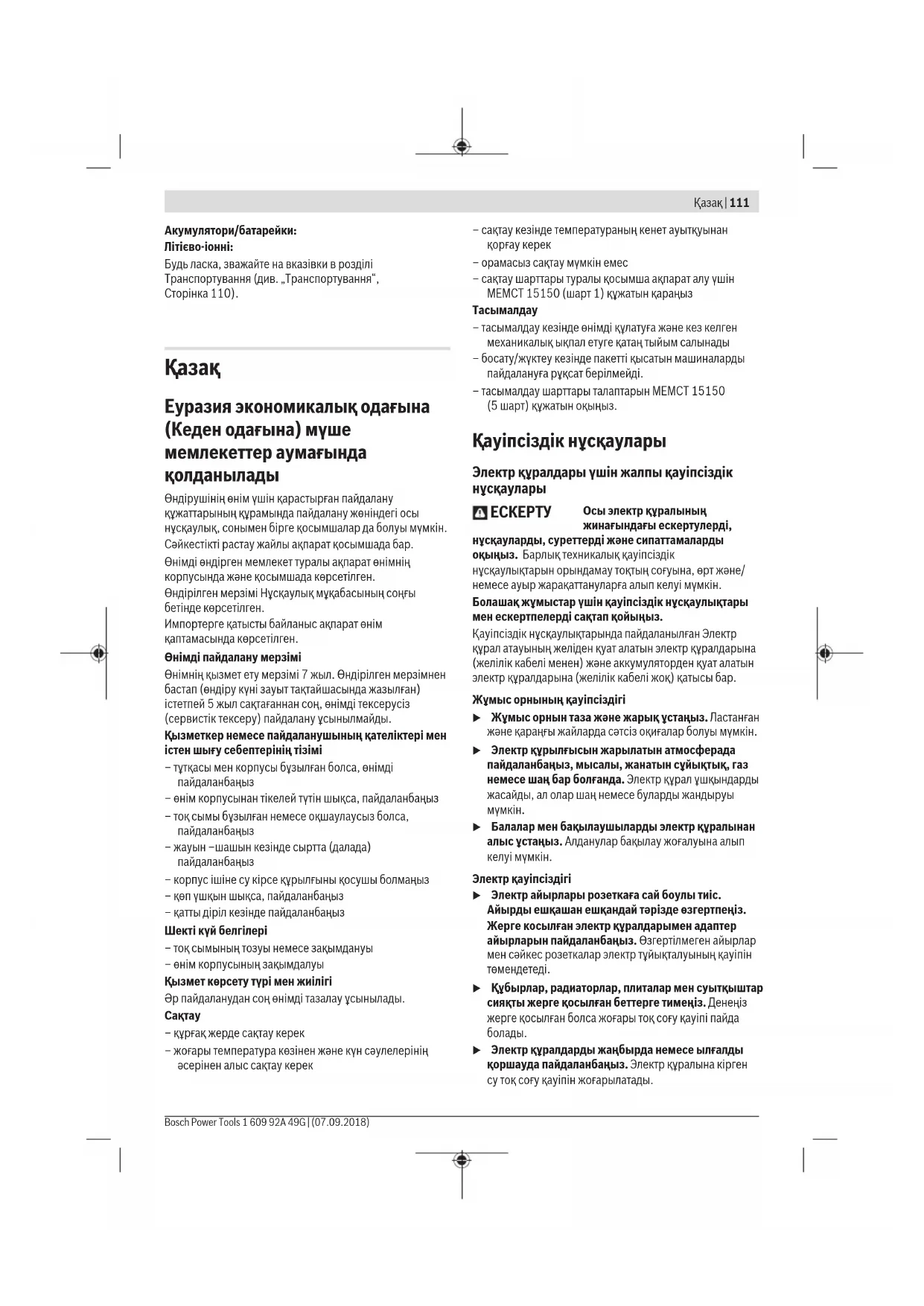 u Электр құралдарды жаңбырда немесе ылғалды қоршауда пайдаланбаңыз. Электр құралына кірген су тоқ соғу қауіпін жоғарылатады. Қазақ | 111 Bosch Power Tools 1 609 92A 49G | (07.09.2018)112 | Қазақ 1 609 92A 49G | (07.09.2018) Bosch Power Tools u Кабельді тиісті болмаған ретте пайдаланбаңыз. Кабельді электр құралын тасу, көтеру немесе тоқтан шығару үшін пайдаланбаңыз. Кабельді ыстықтық, май, өткір қырлар және жылжымалы бөлшектерден алыс ұстамаңыз. Зақымдалған немесе бытысып кеткен кабель тоқ соғу қауіпін жоғарылатады. u Электр құралын сыртта пайдаланғанда сыртқы жайлар үшін сай кабельді пайдаланыңыз. Сыртта пайдалануға жарамды кабельді пайдалану тоқ соғу қауіпін төмендейді. u Егер электр құралын ылғалды жерде пайдалану керек болса, онда қорғайтын өшіру құрылғысы (RCD) арқылы қорғалған тоқ желісін пайдаланыңыз. RCD пайдалану тоқ соғу қауіпін төмендетеді. Жеке қауіпсіздік u Электр құралды пайдалануда абай болыңыз, жұмысыңызды бақылаңыз және парасатты пайдаланыңыз. Электр құралды шаршаған кезде немесе есірткі, алкоголь немесе дәрі әсер еткен кезде пайдаланбаңыз. Электр құралын пайдалану кезінде аңсыздық ауыр жеке жарақаттануға алып келуі