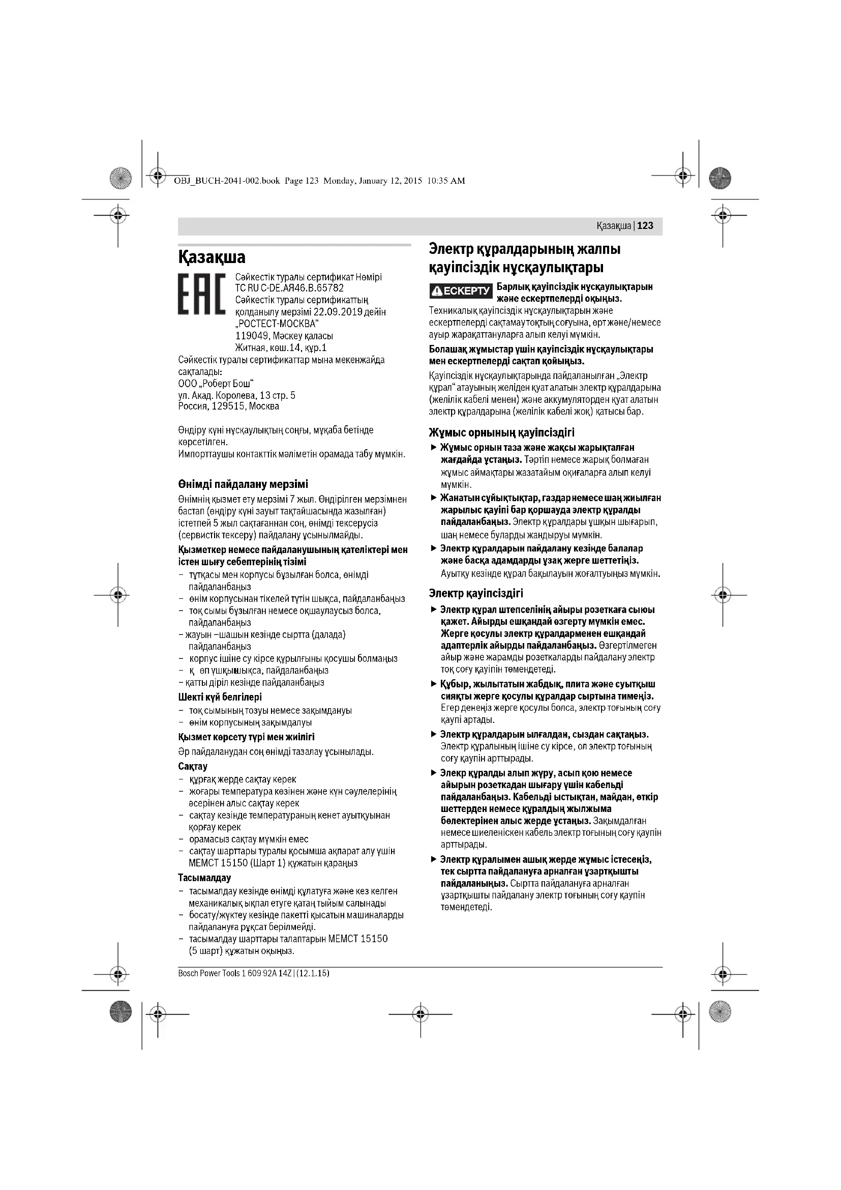 ООО „Роберт Бош“ ул. Акад. Королева, 13 стр. 5 Россия, 129515, Москва Өндіру күні нұсқаулықтың соңғы, мұқаба бетінде көрсетілген. Импорттаушы контакттік мәліметін орамада табу мүмкін. Өнімді пайдалану мерзімі Өнімнің қызмет ету мерзімі 7 жыл. Өндірілген мерзімнен бастап (өндіру күні зауыт тақтайшасында жазылған) істетпей 5 жыл сақтағаннан соң, өнімді тексерусіз (сервистік тексеру) пайдалану ұсынылмайды. Қызметкер немесе пайдаланушының қателіктері мен істен шығу себептерінің тізімі –тұтқасы мен корпусы бұзылған болса, өнімді пайдаланбаңыз – өнім корпусынан тікелей түтін шықса, пайдаланбаңыз –тоқ сымы бұзылған немесе оқшаулаусыз болса, пайдаланбаңыз – жауын –шашын кезінде сыртта (далада) пайдаланбаңыз – корпус ішіне су кірсе құрылғыны қосушы болмаңыз