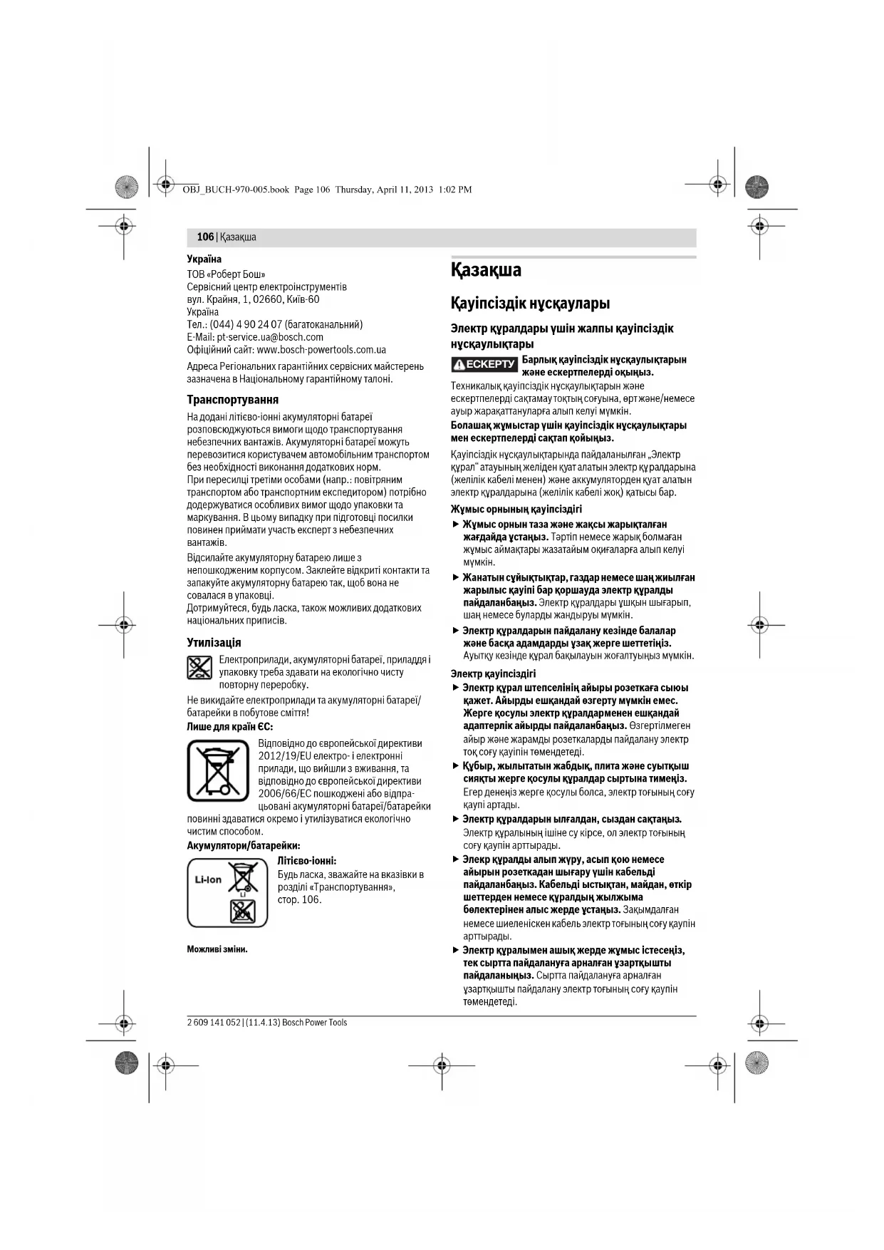 Електроприлади, акумуляторні батареї, приладдя і упаковку треба здавати на екологічно чисту повторну переробку. Не викидайте електроприлади та акумуляторні батареї/ батарейки в побутове сміття! Лише для країн ЄС: Відповідно до європейської директиви 2012/19/EU електро- і електронні прилади, що вийшли з вживання, та відповідно до європейської директиви 2006/66/EC пошкоджені або відпра- цьовані акумуляторні батареї/батарейки повинні здаватися окремо і утилізуватися екологічно чистим способом. Акумулятори/батарейки: Літієво-іонні: Будь ласка, зважайте на вказівки в розділі «Транспортування», стор. 106. Можливі зміни. Қaзақша Қауіпсіздік нұсқаулары Электр құралдары үшін жалпы қауіпсіздік нұсқаулықтары Барлық қауіпсіздік нұсқаулықтарын және ескертпелерді оқыңыз. Техникалық қауіпсіздік нұсқаулықтарын және ескертпелерді сақтамау тоқтың соғуына, өрт және/немесе ауыр жарақаттануларға алып келуі мүмкін. Болашақ жұмыстар үшін қауіпсіздік нұсқаулықтары мен ескертпелерді сақтап қойыңыз. Қауіпсіздік нұсқаулықтарында пайдаланылған „Электр құрал“ атауының желіден қуат алатын электр құ