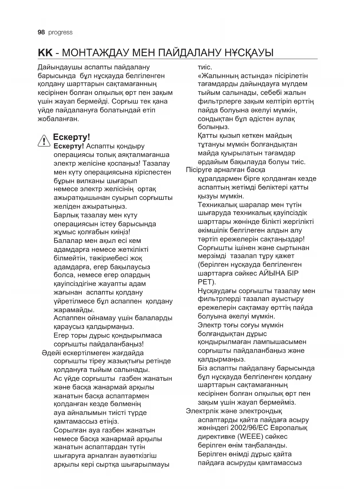 Нұсқаудағы сорғышты тазалау мен фильтрлерді тазалап ауыстыру ережелерін сақтамау өрттің пайда болуына əкелуі мүмкін. Электр тоғы соғуы мүмкін болғандықтан дұрыс қондырылмаған лампышасымен сорғышты пайдаланбаңыз жəне қалдырмаңыз. Біз аспапты пайдалану барысында бұл нұсқауда белгіленген қолдану шарттарын сақтамағанның кесірінен болған олқылық өрт пен зақым үшін жауап бермейміз. Электрлік жəне электрондық аспаптарды қайта пайдаға асыру жөніндегі 2002/96/ЕС Европалық директивке (WEEE) сəйкес берілген өнім таңбаланды. Берілген өнімді дұрыс қайта пайдаға асыруды қамтамассызprogress 99 етумен, Сіз қоршаған ортаға жəне адам денсаулығына кері əсерін тигізу ді болдырмауға көмектесесіз. Аспаптағы немесе жолдама