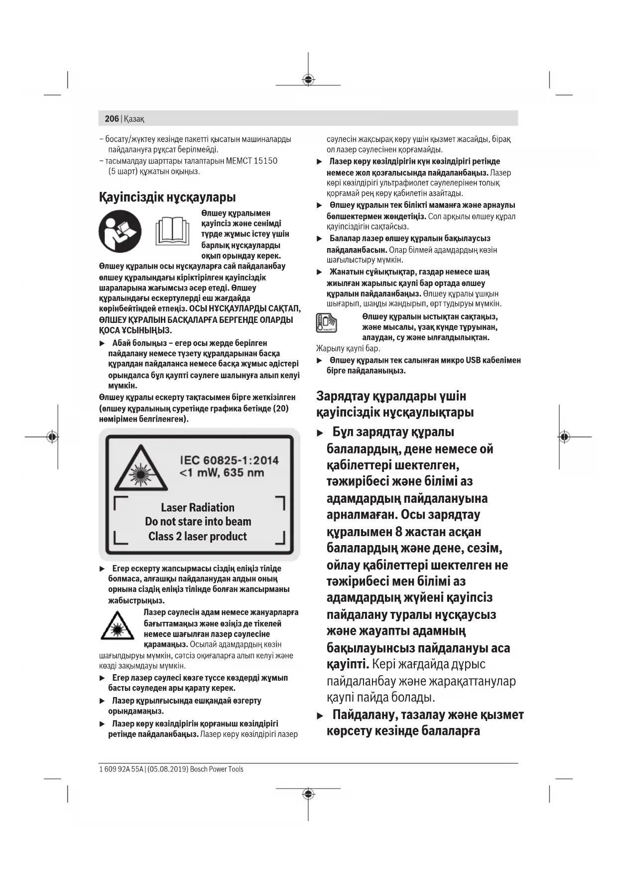 – тасымалдау кезінде өнімді құлатуға және кез келген механикалық ықпал етуге қатаң тыйым салынады Bosch Power Tools 1 609 92A 55A | (05.08.2019)206 | Қазақ – босату/жүктеу кезінде пакетті қысатын машиналарды пайдалануға рұқсат берілмейді. – тасымалдау шарттары талаптарын МЕМСТ 15150 (5шарт) құжатын оқыңыз. Қауіпсіздік нұсқаулары Өлшеу құралымен қауіпсіз және сенімді түрде жұмыс істеу үшін барлық нұсқауларды оқып орындау керек. Өлшеу құралын осы нұсқауларға сай пайдаланбау өлшеу құралындағы кіріктірілген қауіпсіздік шараларына жағымсыз әсер етеді. Өлшеу құралындағы ескертулерді еш жағдайда көрінбейтіндей етпеңіз. ОСЫ НҰСҚАУЛАРДЫ САҚТАП, ӨЛШЕУ ҚҰРАЛЫН БАСҚАЛАРҒА БЕРГЕНДЕ ОЛАРДЫ ҚОСА ҰСЫНЫҢЫЗ. u Абай болыңыз – егер осы жерде берілген пайдалану немесе түзету құралдарынан басқа құралдан пайдаланса немесе басқа жұмыс әдістері орындалса бұл қаупті сәулеге шалынуға алып келуі