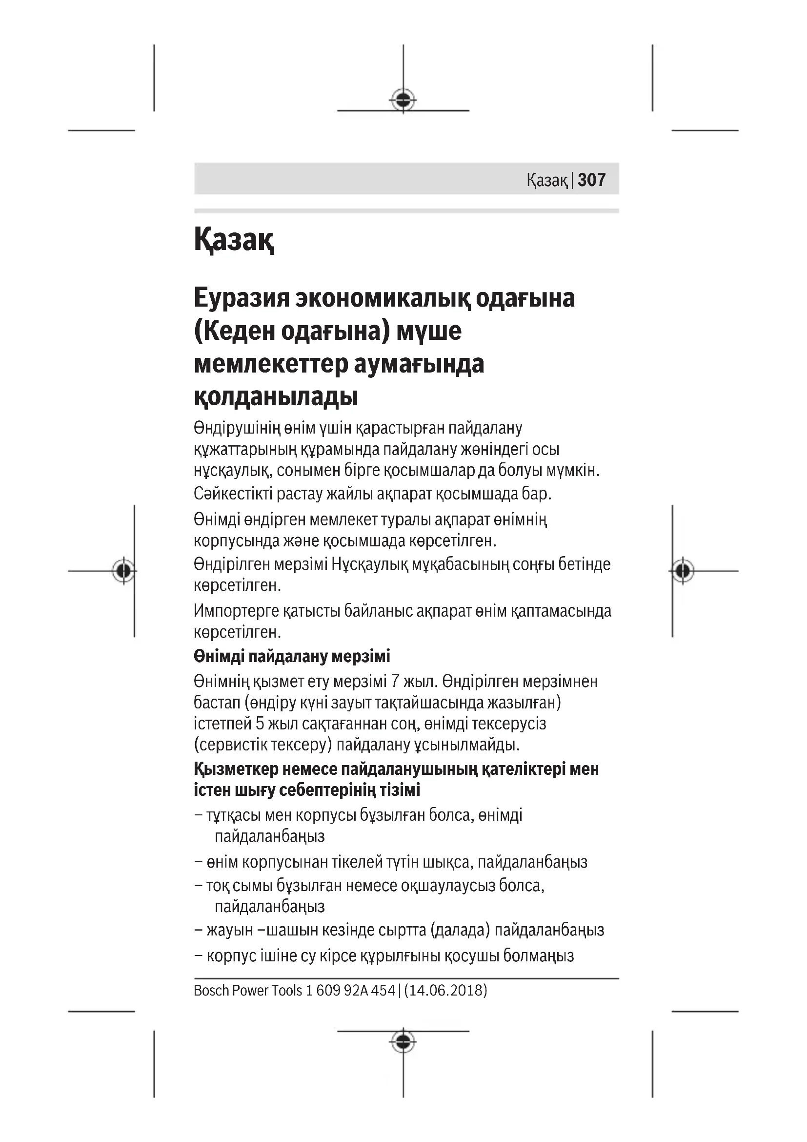 Вимірювальні прилади, приладдя і упаковку треба здавати на екологічно чисту повторну переробку. Не викидайте вимірювальні інструменти і батарейки в побутове сміття! Лише для країнЄС: Відповідно до європейської директиви 2012/19/EU вимірювальні інструменти, що вийшли із вживання, та відповідно до європейської директиви 2006/66/EC пошкоджені або відпрацьовані акумуляторні батареї/ батарейки повинні здаватися окремо і утилізуватися екологічно чистим способом.Қазақ Еуразия экономикалық одағына (Кеден одағына) мүше мемлекеттер аумағында қолданылады Өндірушінің өнім үшін қарастырған пайдалану құжаттарының құрамында пайдалану жөніндегі осы нұсқаулық, сонымен бірге қосымшалар да болуы мүмкін. Сəйкестікті растау жайлы ақпарат қосымшада бар. Өнімді өндірген мемлекет туралы ақпарат өнімнің корпусында жəне қосымшада көрсетілген. Өндірілген мерзімі Нұсқаулық мұқабасының соңғы бетінде көрсетілген. Импортерге қатысты байланыс ақпарат өнім қаптамасында көрсетілген. Өнімді пайдалану мерзімі Өнімнің қызмет ету мерзімі 7 жыл. Өндірілген мерзімнен бастап (өндіру күні зауыт тақтайшасында жазылған) істетпей 5 жыл сақтағаннан соң, өнімді тексерусіз (сервистік тексеру) пайдалану ұсынылмайды. Қызметкер немесе пайдаланушының қателіктері мен істен шығу себептерінің тізімі – тұтқасы мен корпусы бұзылған болса, өнімді пайдаланбаңыз – өнім корпусынан тікелей түтін шықса, пайдаланбаңыз – тоқ сымы бұзылған немесе оқшаулаусыз болса, пайдаланбаңыз – жауын –шашын кезінде сыртта (далада) пайдаланбаңыз – корпус ішіне су кірсе құрылғыны қосушы болмаңыз Қазақ | 307 Bosch Power Tools 1 609 92A 454 | (14.06.2018)308 | Қазақ 1 609 92A 454 | (14.06.2018) Bosch Power Tools – қөп үшқын шықса, пайдаланбаңыз – қатты діріл кезінде пайдаланбаңыз Шекті күй белгілері – тоқ сымының тозуы немесе зақымдануы – өнім корпусының зақымдалуы Қызмет көрсету түрі мен жиілігі Әр пайдаланудан соң өнімді тазалау ұсынылады.