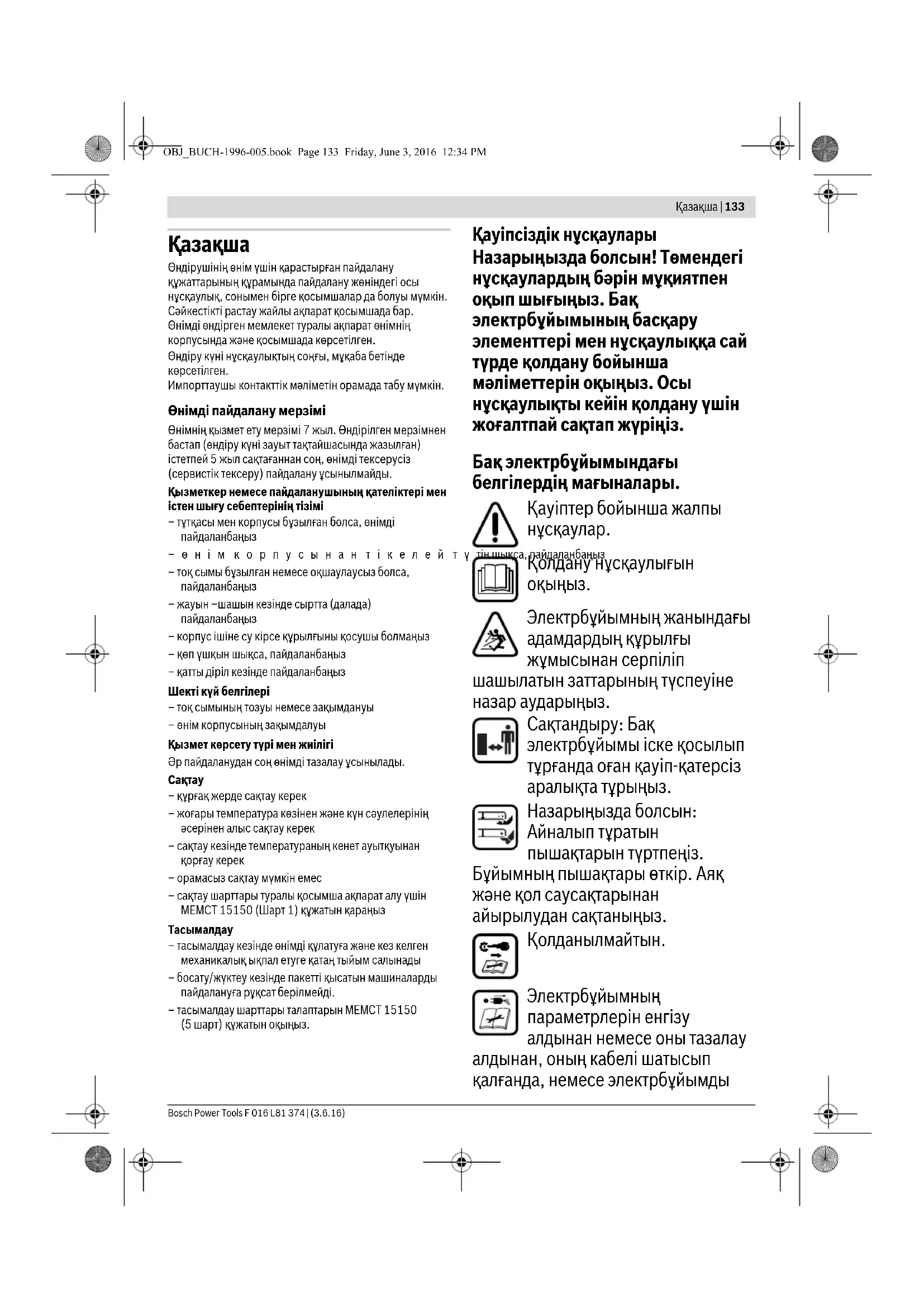 OBJ_BUCH-1996-005.book Page 135 Thursday, January 14, 2016 1:02 PM136 | Қазақша F 016 L81 374 | (14.1.16) Bosch Power Tools Бақ электрбұйымымен жұмыс істегеніңізде оның шығару бөлшегінен ұзақ тұрыңыз. Қозғалтқышы істе болып тұрған бақ электрбұйымын ешқашан көтермеңіз немесе тасымаңыз. Бақ электрбұйымында ешбір өзгерту жұмыстарын өткізбеңіз. Рұқсат етілмеген өзгерту жұмыстары бақ электрбұйымыңыздың қауіпсіздігін зақымдап, шуылдар мен вибрациялардың өсіп күшейтілуіне апара алады. Қосу кабелі мен қолданылатын ұзарту кабелін ұдайы тексеріп жүруіңіз лазым. Зақымданып бұзылған кабелін электр тоқ беру жүйесіне қоспаңыз, немесе оны электр тоқ беру жүйесінен шығарғанша дейін қолыңызбен ұстамаңыз. Зақымданып бұзылған кабелінде кернеу өткізетін бөлшектеріне тиіп кетуіңіз мүмкін. Электр тоқ соққысы арқылы пайда бола алатын қауіптерінен сақтаныңыз. Төменгі жағдайларда электр айырын электррозеткасынан шығару керек: – бақ электрбұйымды қалдырып кетуіңіз керек болып қалғанда