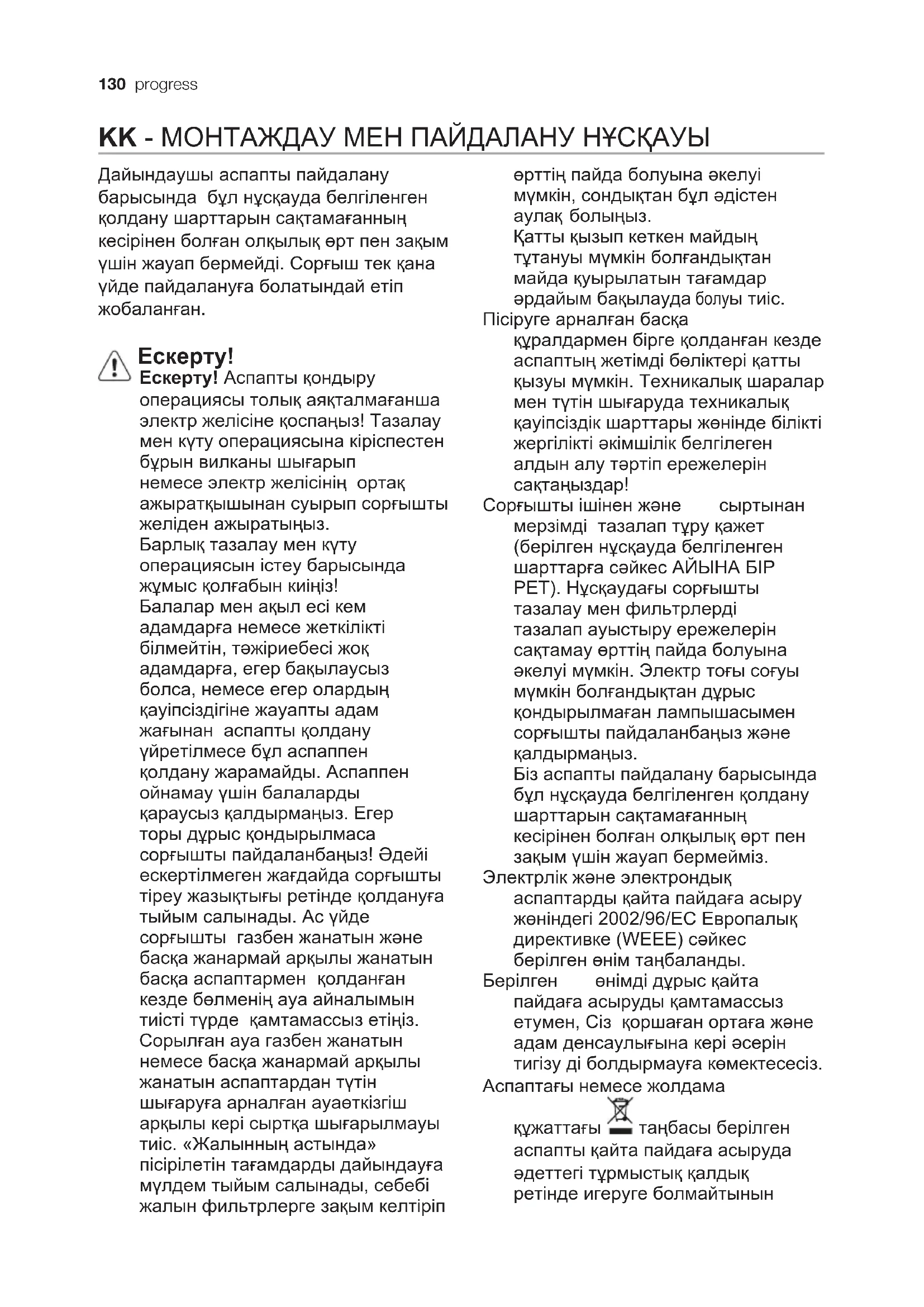 таңбасы берілген аспапты қайта пайдаға асыруда əдеттегі тұрмыстық қалдық ретінде игеруге болмайтынынprogress 131 көрсетеді. Оның орнына электрлік жəне электрондық аспаптарды қайта пайдаға асыруға арналған қабылдау пунктіне тапсыру керек. Бұзуға тапсыру аспапты қайта пайдаға асыру жөніндегі жергілікті ережелерге сəйкес шығарылуы