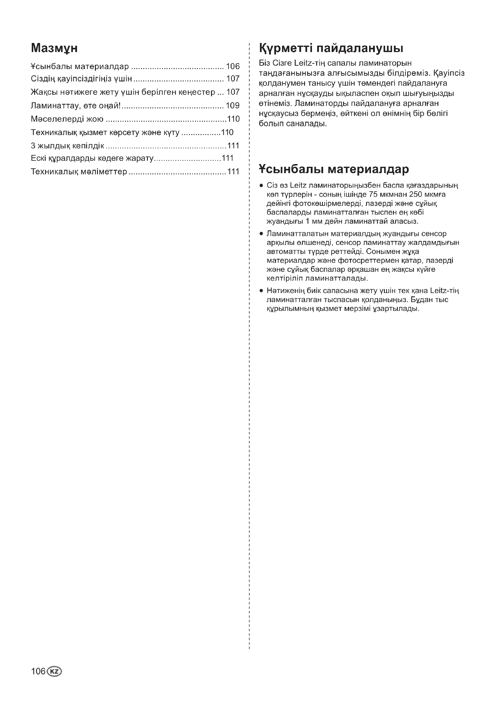 Қүрметті пайдаланушы Біз Сізге Leitz-тің сапалы ламинаторын таңдағанынызға алғысымызды білдіреміз. Қауіпсіз қолданумен танысу үшін төмендегі пайдалануға арналған нұсқауды ықыласпен оқып шығуыңызды өтінеміз. Ламинаторды пайдалануға арналған нұсқаусыз бермеңіз, өйткені ол өнімнің бір бөлігі болып саналады.