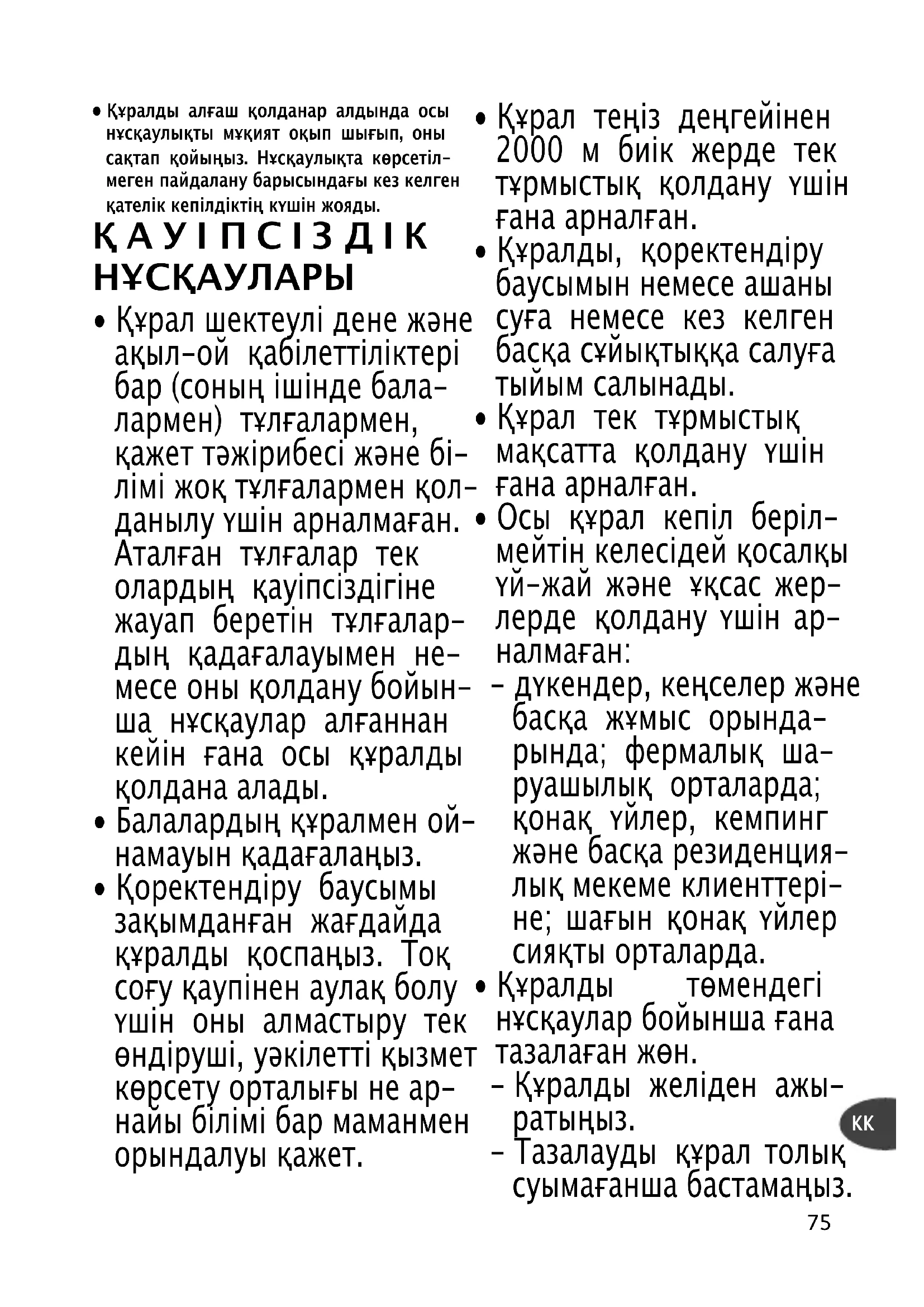- Құрал шектеулі дене және ақыл-ой қабілеттіліктері бар (соның ішінде бала- лармен) тұлғалармен, қажет тәжірибесі және бі- лімі жоқ тұлғалармен қол- данылу үшін арналмаған. Аталған тұлғалар тек олардың қауіпсіздігіне жауап беретін тұлғалар- дың қадағалауымен не- месе оны қолдану бойын- ша нұсқаулар алғаннан кейін ғана осы құралды қолдана алады.
