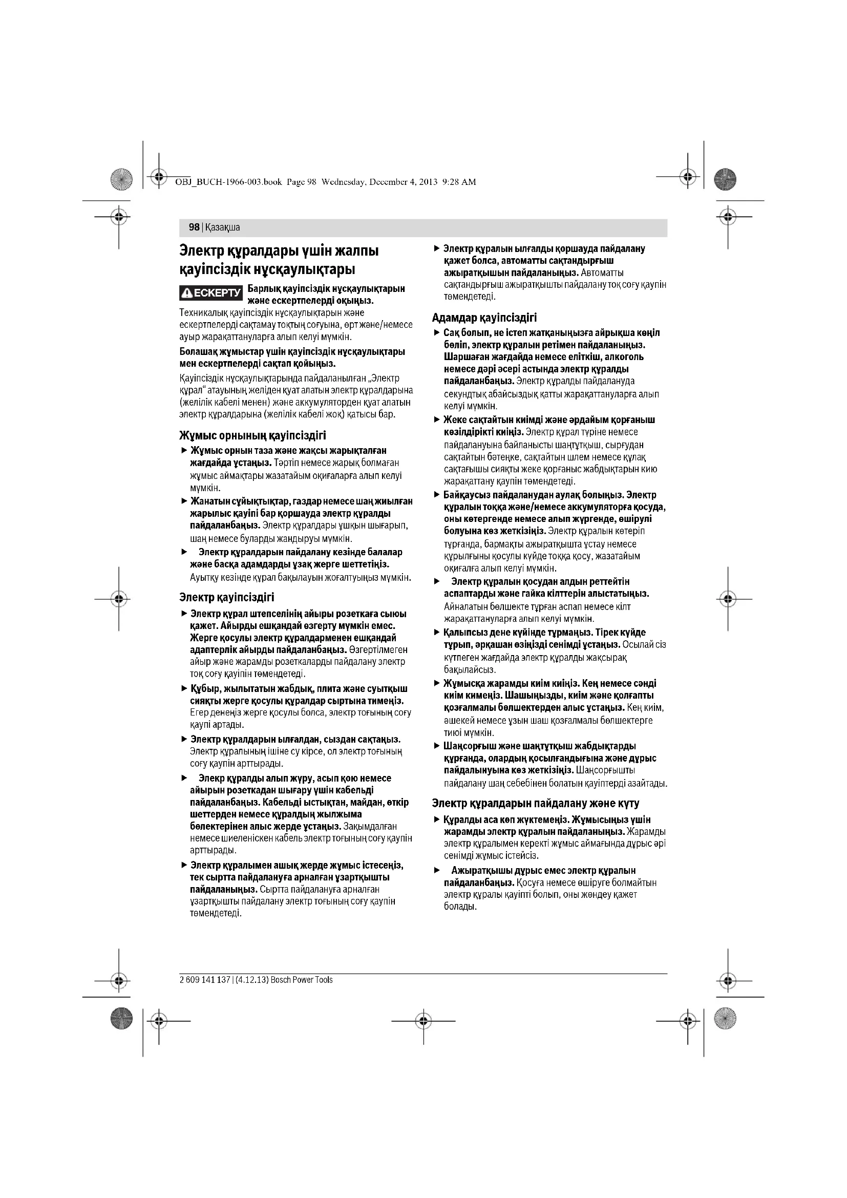 Вибір приладдя – 163 Дія Малюнок Сторінка OBJ_BUCH-1966-003.book Page 97 Wednesday, December 4, 2013 9:28 AM98 | Қaзақша 2 609 141 137 | (4.12.13) Bosch Power Tools Электр құралдары үшін жалпы қауіпсіздік нұсқаулықтары Барлық қауіпсіздік нұсқаулықтарын және ескертпелерді оқыңыз. Техникалық қауіпсіздік нұсқаулықтарын және ескертпелерді сақтамау тоқтың соғуына, өрт және/немесе ауыр жарақаттануларға алып келуі мүмкін. Болашақ жұмыстар үшін қауіпсіздік нұсқаулықтары мен ескертпелерді сақтап қойыңыз. Қауіпсіздік нұсқаулықтарында пайдаланылған „Электр құрал“ атауының желіден қуат алатын электр құралдарына (желілік кабелі менен) және аккумуляторден қуат алатын электр құралдарына (желілік кабелі жоқ) қатысы бар. Жұмыс орнының қауіпсіздігі Жұмыс орнын таза және жақсы жарықталған жағдайда ұстаңыз. Тәртіп немесе жарық болмаған жұмыс аймақтары жазатайым оқиғаларға алып келуі