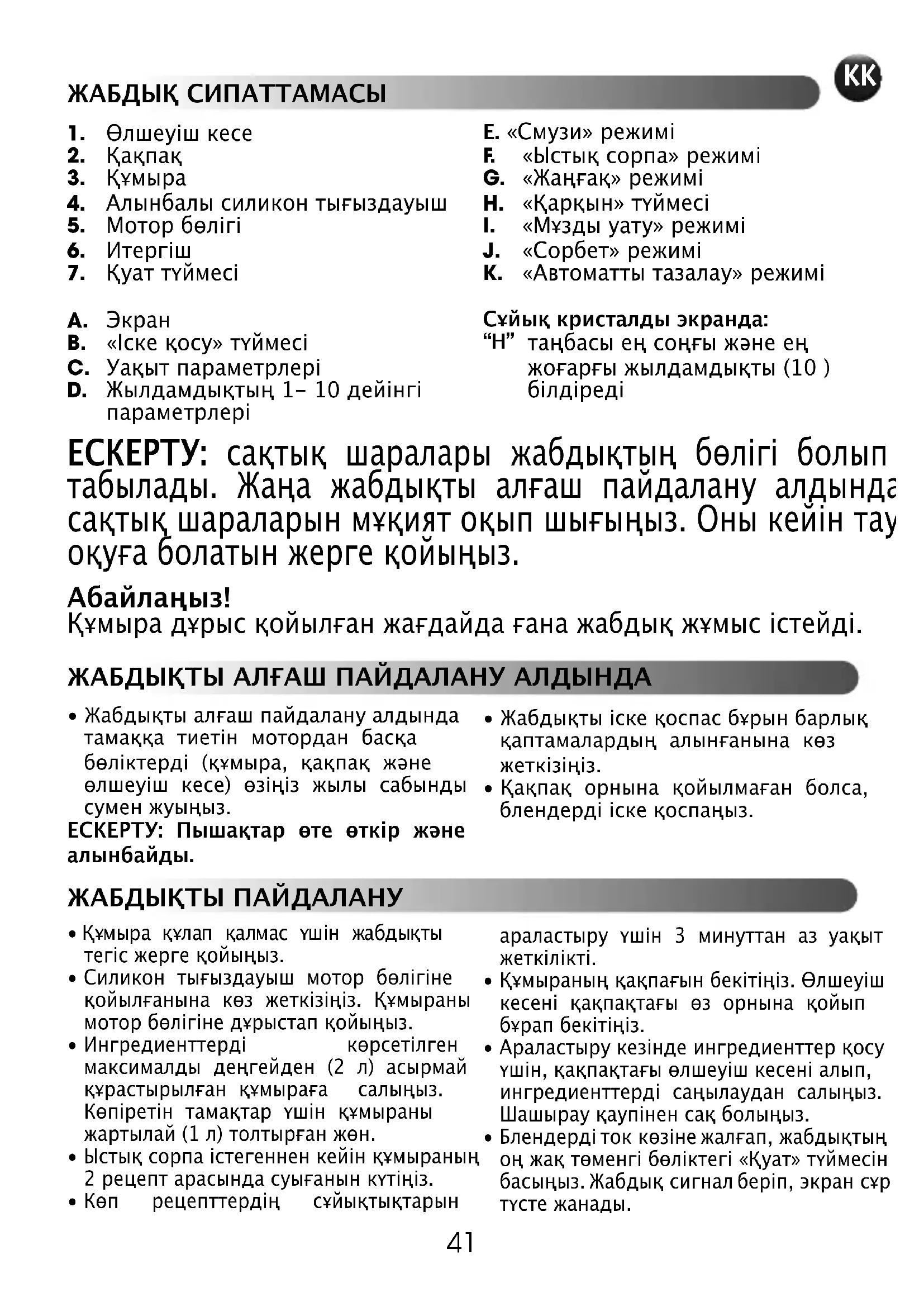 - Жабдықты алғаш пайдалану алдындатамаққа тиетін мотордан басқабөліктерді (құмыра, қақпақ жәнеөлшеуіш кесе) өзіңіз жылы сабындысумен жуыңыз.ЕСКЕРТУ: Пышақтар өте өткір жәнеалынбайды.• Жабдықты іске қоспас бұрын барлыққаптамалардың алынғанына көзжеткізіңіз.• Қақпақ орнына қойылмаған болса,блендерді іске қоспаңыз. ЕСКЕРТУ: сақтық шаралары жабдықтың бөлігі болып табылады. Жаңа жабдықты алғаш пайдалану алдында сақтық шараларын мұқият оқып шығыңыз. Оны кейін тауып оқуға болатын жерге қойыңыз.