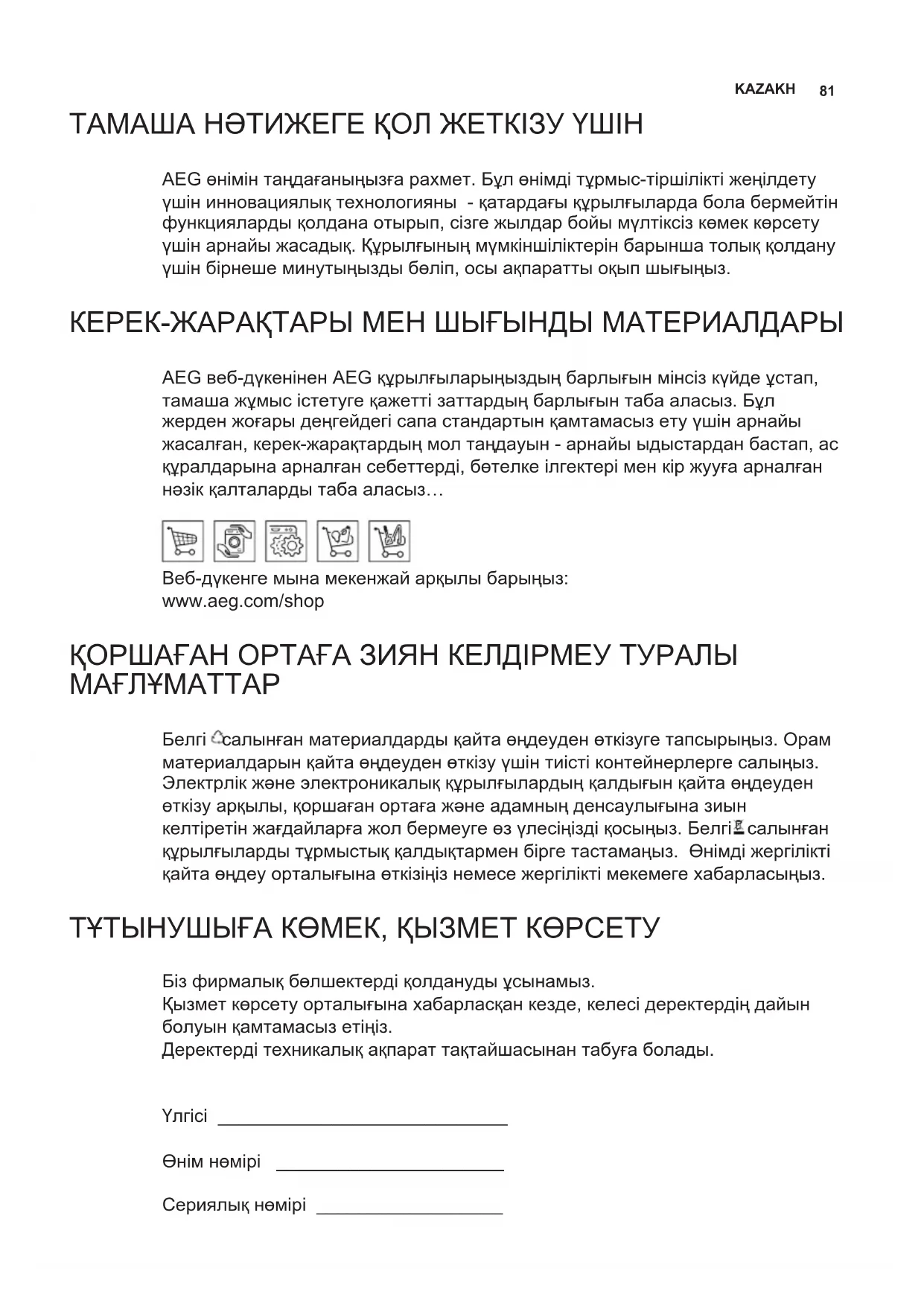 След 100 часа работа светодиодът започва да свети постоянно, за да сигнализира за задръстване на металните филтри за мазнини. След 200 часа работа светодиодът започва да мига, за да сигнализира за задръстване на филтрите с активен въглен.81 KAZAKH ТАМАША НӘТИЖЕГЕ ҚОЛ ЖЕТКІЗУ ҮШІН AEG өнімін таңдағаныңызға рахмет. Бұл өнімді тұрмыс-тіршілікті жеңілдету үшін инновациялық технологияны - қатардағы құрылғыларда бола бермейтін функцияларды қолдана отырып, сізге жылдар бойы мүлтіксіз көмек көрсету үшін арнайы жасадық. Құрылғының мүмкіншіліктерін барынша толық қолдану үшін бірнеше минутыңызды бөліп, осы ақпаратты оқып шығыңыз. КЕРЕК-ЖАРАҚТАРЫ МЕН ШЫҒЫНДЫ МАТЕРИАЛДАРЫ AEG веб-дүкенінен AEG құрылғыларыңыздың барлығын мінсіз күйде ұстап, тамаша жұмыс істетуге қажетті заттардың барлығын таба аласыз. Бұл жерден жоғары деңгейдегі сапа стандартын қамтамасыз ету үшін арнайы жасалған, керек-жарақтардың мол таңдауын - арнайы ыдыстардан бастап, ас құралдарына арналған себеттерді, бөтелке ілгектері мен кір жууға арналған нәзік қалталарды таба аласыз… Веб-дүкенге мына мекенжай арқылы барыңыз: www.aeg.com/shop ҚОРШАҒАН ОРТАҒА ЗИЯН КЕЛДІРМЕУ ТУРАЛЫ МАҒЛҰМАТТАР Белгі салынған материалдарды қайта өңдеуден өткізуге тапсырыңыз. Орам материалдарын қайта өңдеуден өткізу үшін тиісті контейнерлерге салыңыз. Электрлік және электроникалық құрылғылардың қалдығын қайта өңдеуден өткізу арқылы, қоршаған ортаға және адамның денсаулығына зиын келтіретін жағдайларға жол бермеуге өз үлесіңізді қосыңыз. Белгі салынған құрылғыларды тұрмыстық қалдықтармен бірге тастамаңыз. Өнімді жергілікті қайта өңдеу орталығына өткізіңіз немесе жергілікті мекемеге хабарласыңыз. ТҰТЫНУШЫҒА КӨМЕК, ҚЫЗМЕТ КӨРСЕТУ Біз фирмалық бөлшектерді қолдануды ұсынамыз. Қызмет көрсету орталығына хабарласқан кезде, келесі деректердің дайын болуын қамтамасыз етіңіз. Деректерді техникалық ақпарат тақтайшасынан табуға болады. Үлгісі ____________________________ Өнім нөмірі ______________________ Сериялық нөмірі __________________82 КЕҢЕСТЕР МЕН ҰСЫНЫСТАР