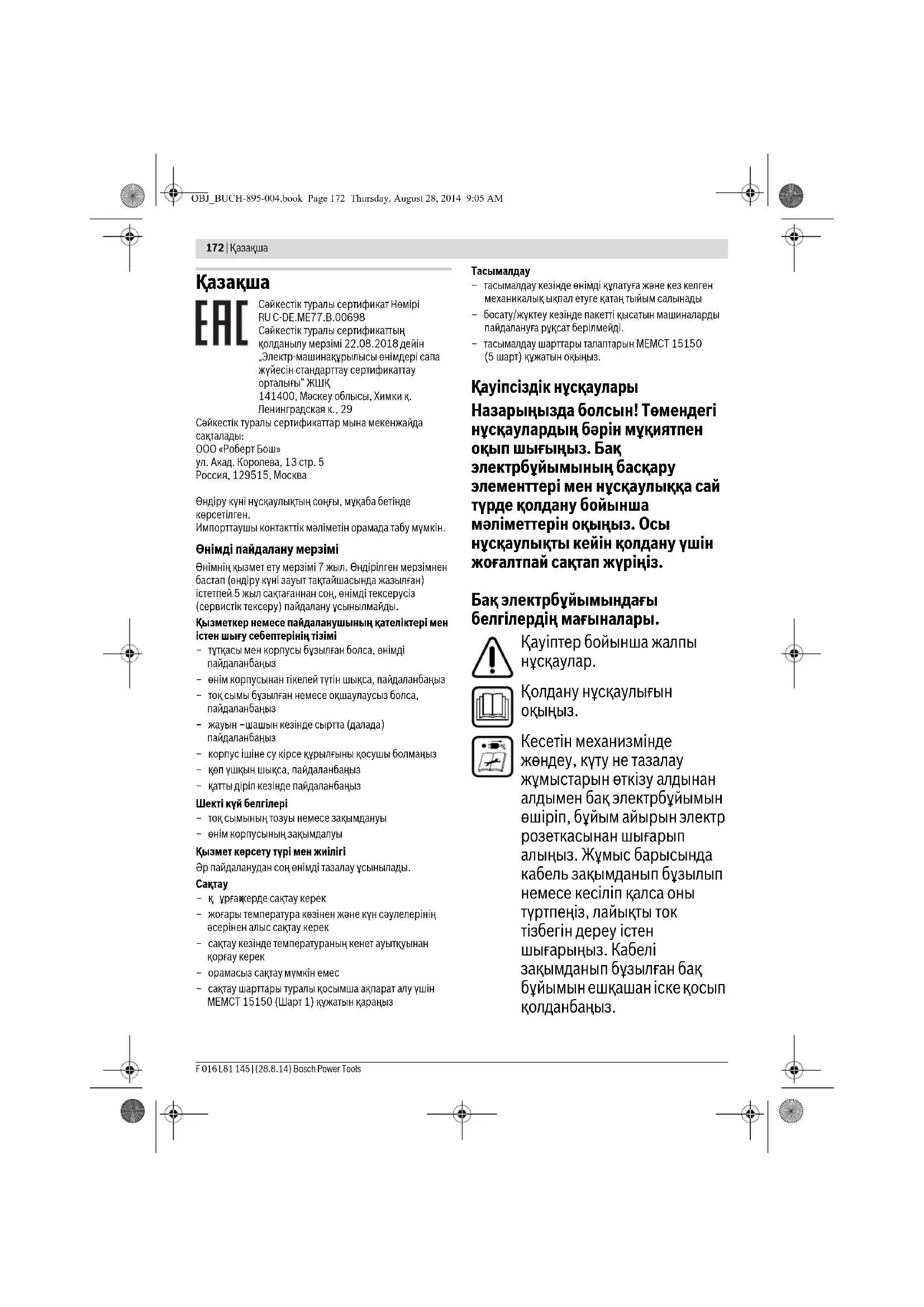 OBJ_BUCH-895-004.book Page 171 Thursday, August 28, 2014 9:05 AM172 | Қазақша F 016 L81 145 | (28.8.14) Bosch Power Tools Қaзақша Сәйкестік туралы сертификат Нөмірi RU C-DE.ME77.B.00698 Сәйкестік туралы сертификаттың қолданылу мерзімі 22.08.2018 дейін „Электр-машинақұрылысы өнімдері сапа жүйесін стандарттау сертификаттау орталығы“ ЖШҚ 141400, Мәскеу облысы, Химки қ. Ленинградская к., 29 Сәйкестік туралы сертификаттар мына мекенжайда