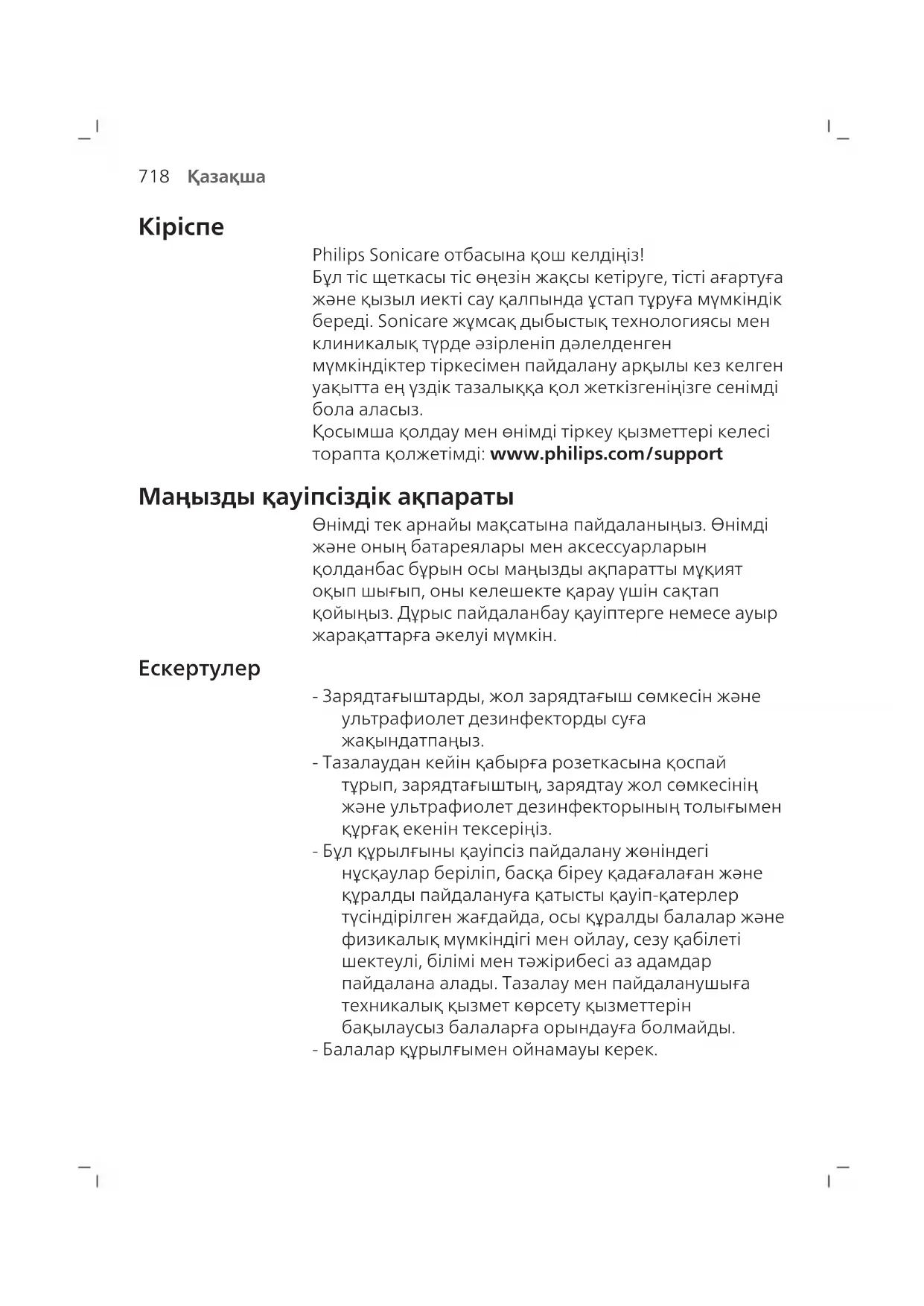 Philips Sonicare отбасына қош келдіңіз! Бұл тіс щеткасы тіс өңезін жақсы кетіруге, тісті ағартуға және қызыл иекті сау қалпында ұстап тұруға мүмкіндік береді. Sonicare жұмсақ дыбыстық технологиясы мен клиникалық түрде әзірленіп дәлелденген мүмкіндіктер тіркесімен пайдалану арқылы кез келген уақытта ең үздік тазалыққа қол жеткізгеніңізге сенімді бола аласыз. Қосымша қолдау мен өнімді тіркеу қызметтері келесі торапта қолжетімді: www.philips.com/support Маңызды қауіпсіздік ақпараты Өнімді тек арнайы мақсатына пайдаланыңыз. Өнімді және оның батареялары мен аксессуарларын қолданбас бұрын осы маңызды ақпаратты мұқият оқып шығып, оны келешекте қарау үшін сақтап қойыңыз. Дұрыс пайдаланбау қауіптерге немесе ауыр жарақаттарға әкелуі мүмкін.