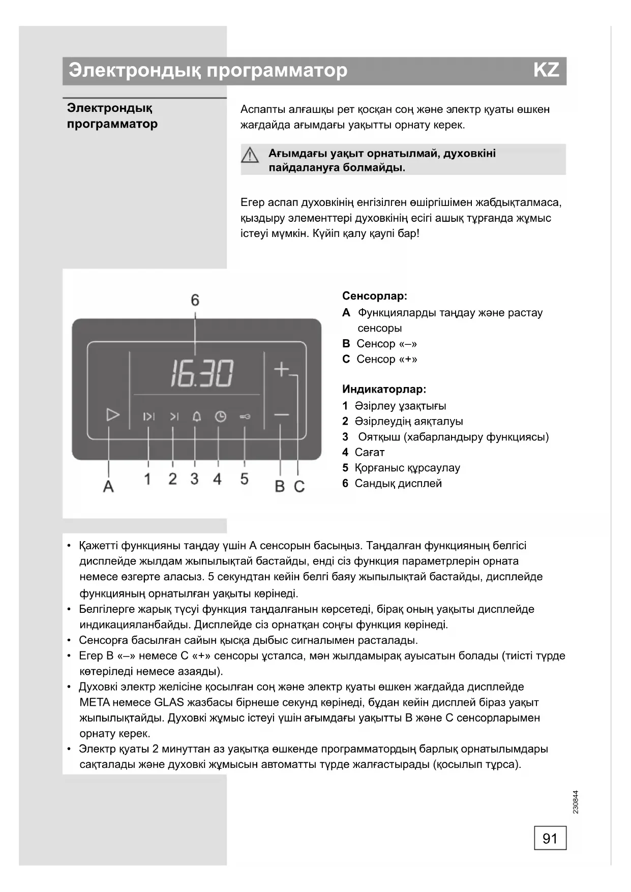 B Сенсор «–» C Сенсор «+» Индикаторлар: 1 Əзірлеу ұзақтығы 2 Əзірлеудің аяқталуы 3 Оятқыш (хабарландыру функциясы) 4 Сағат 5 Қорғаныс құрсаулау 6 Сандық дисплей Аспапты алғашқы рет қосқан соң жəне электр қуаты өшкен жағдайда ағымдағы уақытты орнату керек. Ағымдағы уақыт орнатылмай, духовкіні пайдалануға болмайды. Егер аспап духовкінің енгізілген өшіргішімен жабдықталмаса, қыздыру элементтері духовкінің есігі ашық тұрғанда жұмыс істеуі мүмкін. Күйіп қалу қаупі бар!