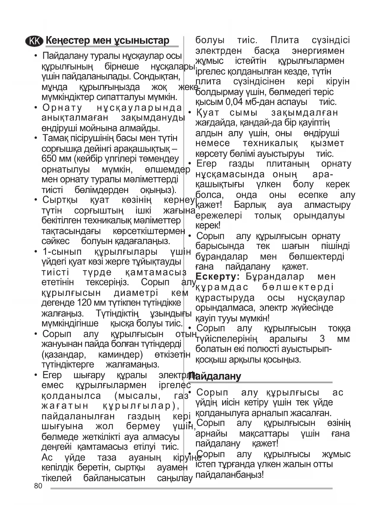 - Егер шығару құралы электрлік емес құрылғылармен іргелес қолданылса (мысалы, газ жағатын құрылғылар), пайдаланылған газдың кері шығуына жол бермеу үшін, бөлмеде жеткілікті ауа алмасуы деңгейі қамтамасыз етілуі тиіс. Ас үйде таза ауаның кіруіне кепілдік беретін, сыртқы ауамен тікелей байланысатын саңылау болуы тиіс. Плита сүзіндісі электрден басқа энергиямен жұмыс істейтін құрылғылармен іргелесқолданылғанкезде,түтін плита сүзіндісінен кері кіруін болдырмауүшін,бөлмедегітеріс қысым0,04мб-данаспауы тиіс.