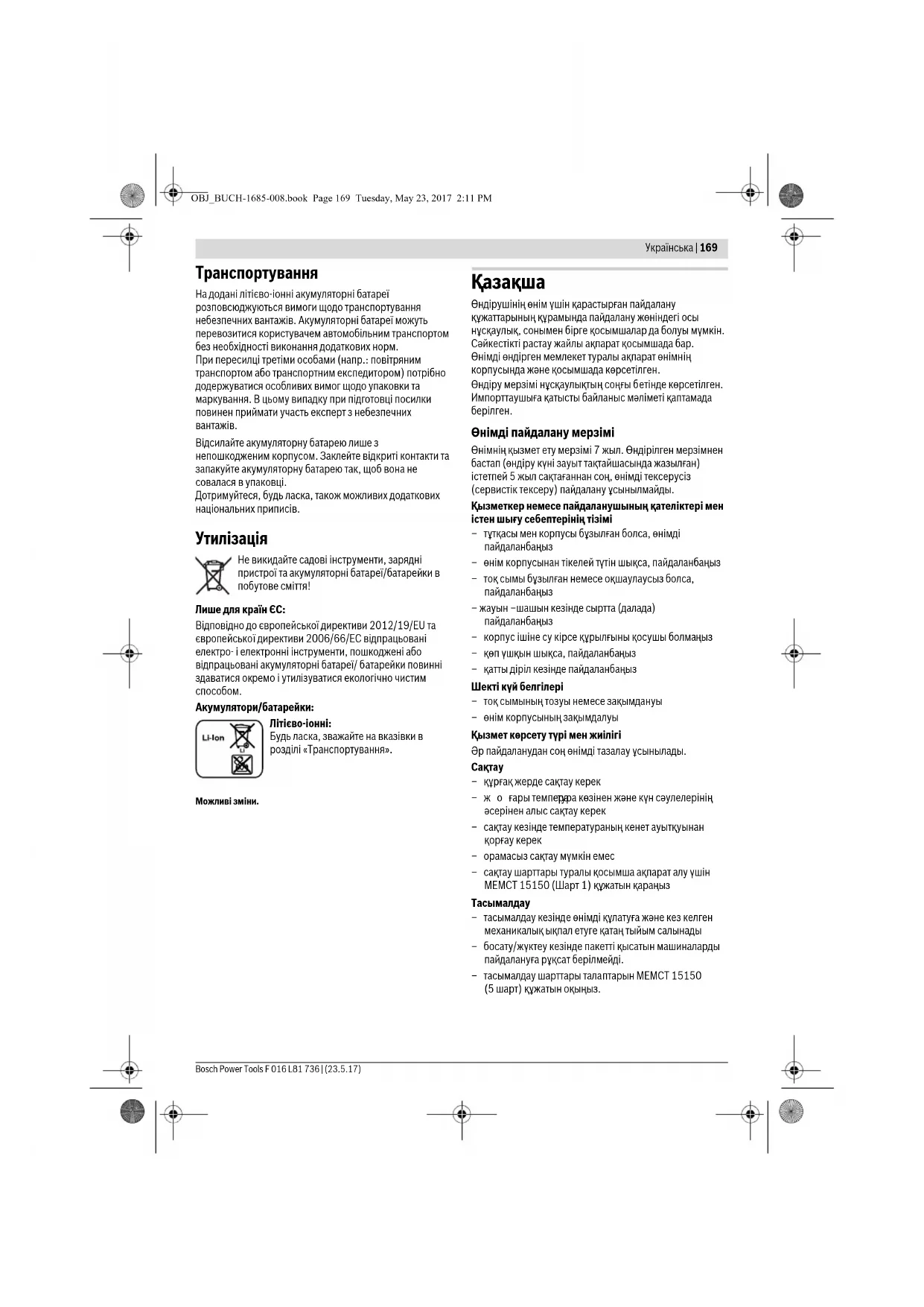 Мысалы, аккумуляторды жылудан, сондай- ақ, үздіксіз күн жарығынан, оттан, судан және ылғалдан қорғаңыз . Жарылу қаупі бар. Аккумулятордан зақымданған немесе дұрыс пайдаланбаған жағдайда бу шығуы мүмкін. Бұл жағдайда ішке таза ауа кіргізіңіз және шағымдар болса, медициналық көмек алыңыз. Булар тыныс алу жолдарын тітіркендіруі мүмкін. Бұл аккумуляторларды тек өзіңіздің Bosch өніміңізде пайдаланыңыз. Тек осы жағдайда аккумулятор ауыр шамадан тыс жүктемелерден қорғалған болады. OBJ_BUCH-1685-008.book Page 172 Tuesday, May 23, 2017 2:11 PMҚазақша | 173 Bosch Power Tools F 016 L81 736 | (23.5.17) Шеге немесе бұрауыш сияқты ұшты заттар немесе сыртқы әсер арқылы аккумулулятор зақымдануы мүмкін. Бұл қысқа тұйықталуға алып келіп, аккумулятор жануы, түтін шығаруы, жарылуы немесе қызып кетуі мүмкін. Аккумуляторды тұйықтамаңыз. Жарылу қаупі бар. Аккумуляторды сұйықтықтардан және ылғалдан
