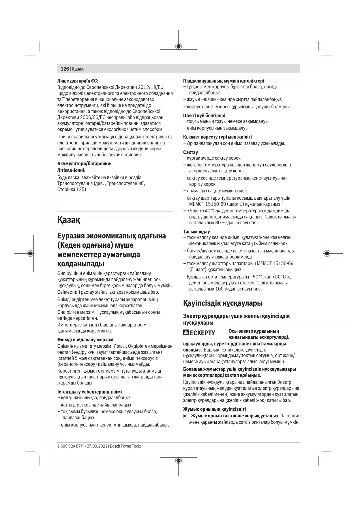 Осы электр құралының жинағындағы ескертулерді, нұсқауларды, суреттерді және сипаттамаларды оқыңыз. Барлық техникалық қауіпсіздік нұсқаулықтарын орындамау тоқтың соғуына, өрт және/ немесе ауыр жарақаттануларға алып келуі мүмкін. Болашақ жұмыстар үшін қауіпсіздік нұсқаулықтары мен ескертпелерді сақтап қойыңыз. Қауіпсіздік нұсқаулықтарында пайдаланылған Электр құрал атауының желіден қуат алатын электр құралдарына (желілік кабелі менен) және аккумуляторден қуат алатын электр құралдарына (желілік кабелі жоқ) қатысы бар. Жұмыс орнының қауіпсіздігі u Жұмыс орнын таза және жарық ұстаңыз. Ластанған және қараңғы жайларда сәтсіз оқиғалар болуы мүмкін. 1 609 92A 87Y | (27.09.2022) Bosch Power ToolsҚазақ | 127 u Электр құрылғысын жарылатын атмосферада пайдаланбаңыз, мысалы, жанатын сұйықтық, газ немесе шаң бар болғанда. Электр құрал ұшқындарды жасайды, ал олар шаң немесе буларды жандыруы