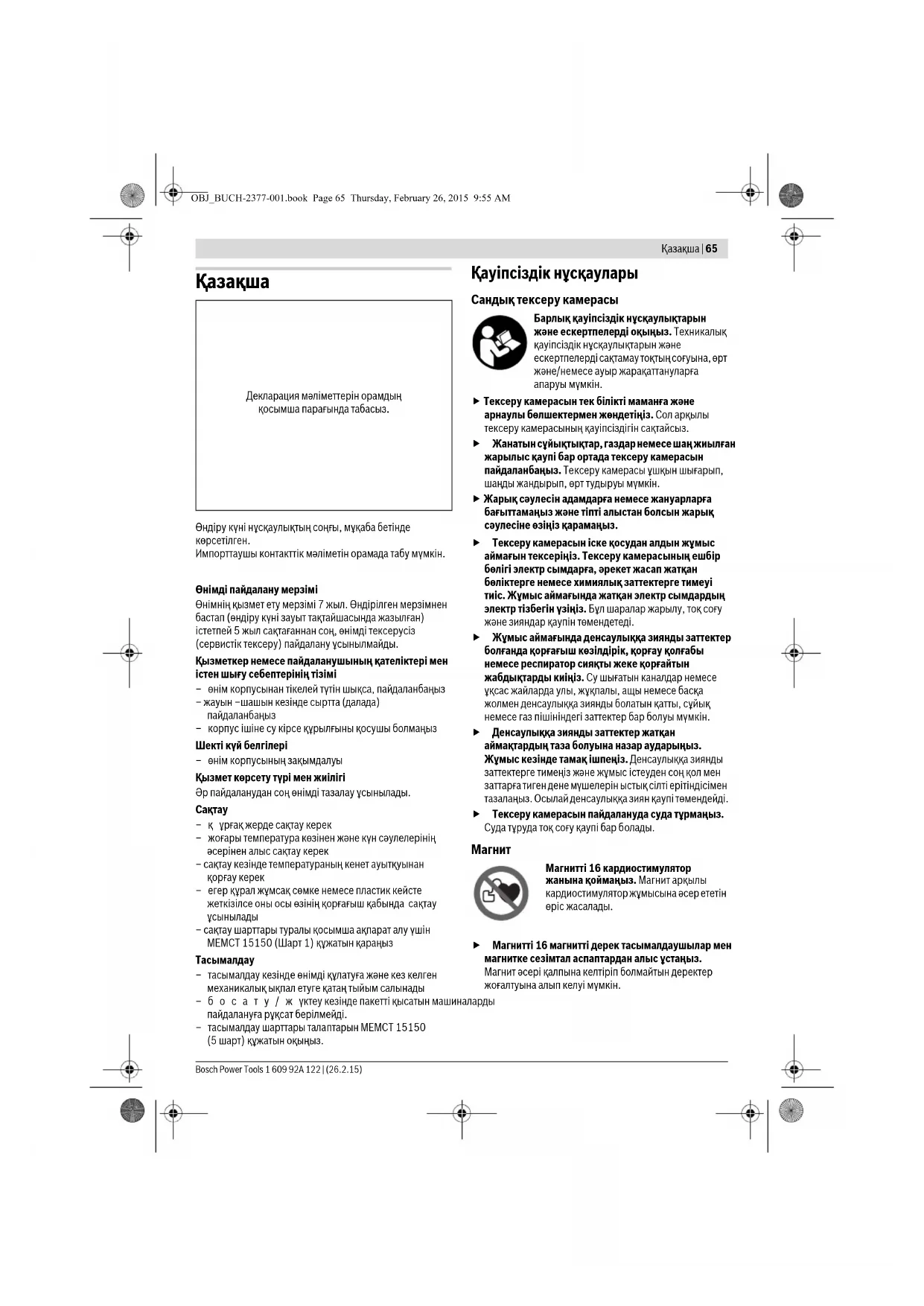 Відеоскоп, батареї, приладдя і упаковку треба здавати на екологічно чисту повторну переробку. Не викидайте відеоскопи та акумуляторні батареї/батарейки в побутове сміття! Лише для країн ЄС: Відповідно до європейської директиви 2012/19/EU та європейської директиви 2006/66/EС відпрацьовані електроін- струменти, пошкоджені акумуляторні батареї/батарейки або акумуляторні батареї/батарейки, що відпрацювали себе, повинні здаватися окремо і утилізуватися екологічно чистим способом. Можливі зміни. OBJ_BUCH-2377-001.book Page 64 Thursday, February 26, 2015 9:55 AMҚaзақша | 65 Bosch Power Tools 1 609 92A 122 | (26.2.15) Қaзақша Өнімді пайдалану мерзімі Өнімнің қызмет ету мерзімі 7 жыл. Өндірілген мерзімнен бастап (өндіру күні зауыт тақтайшасында жазылған) істетпей 5 жыл сақтағаннан соң, өнімді тексерусіз (сервистік тексеру) пайдалану ұсынылмайды. Қызметкер немесе пайдаланушының қателіктері мен істен шығу себептерінің тізімі – өнім корпусынан тікелей түтін шықса, пайдаланбаңыз – жауын –шашын кезінде сыртта (далада) пайдаланбаңыз – корпус ішіне су кірсе құрылғыны қосушы болмаңыз Шекті күй белгілері – өнім корпусының зақымдалуы Қызмет көрсету түрі мен жиілігі Әр пайдаланудан соң өнімді тазалау ұсынылады.