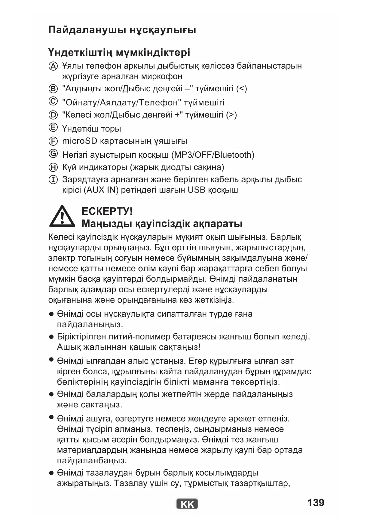 Тұрақты жанып тұр microSD картасындағы ойнату тоқтатылған немесе AUX IN белсенді Көк Жыпылықтайды Bluetooth қосылымы орнатылды Көк/қызыл Жыпылықтайды Bluetooth жұптасу режимі белсенді