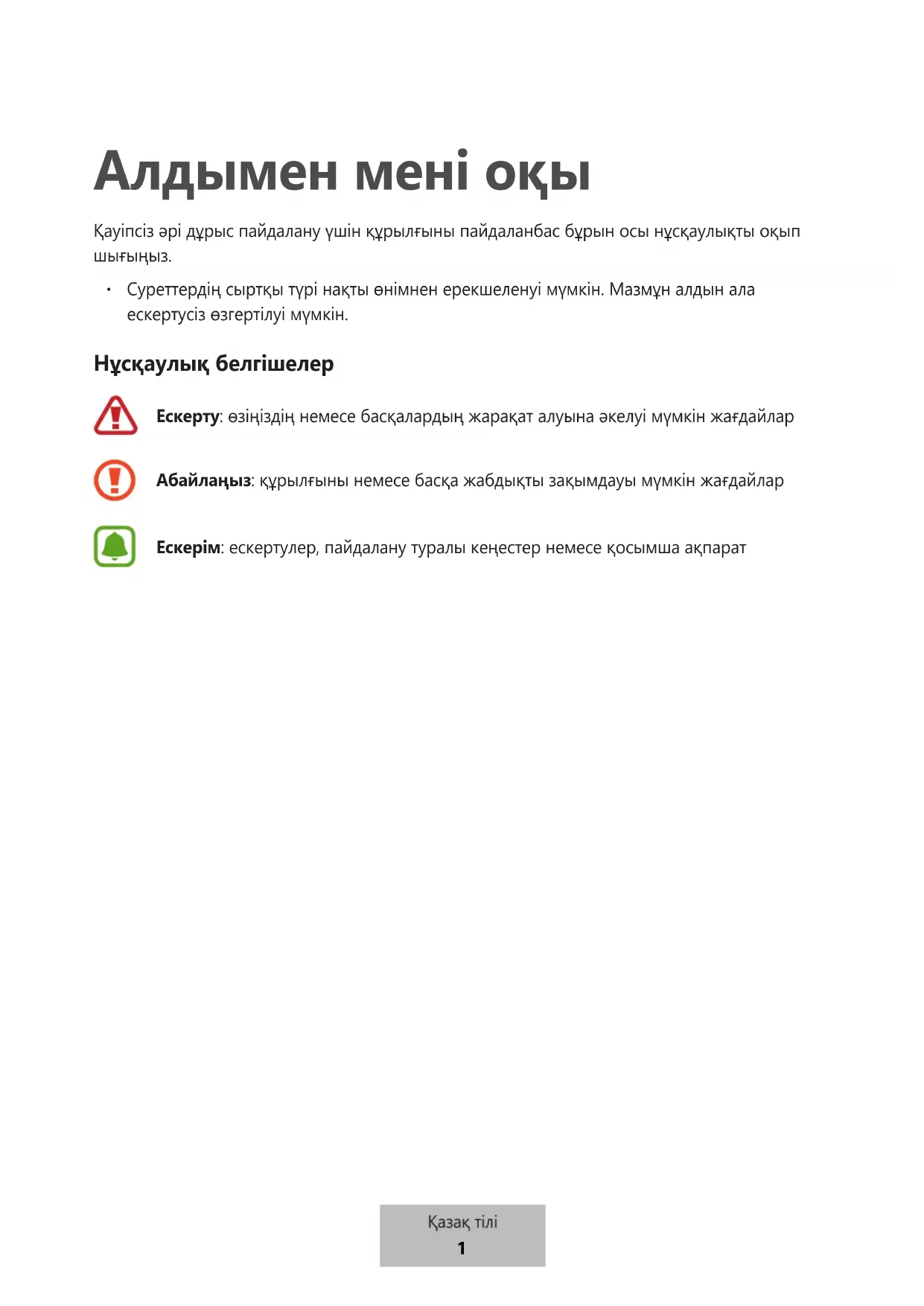 Суреттердің сыртқы түрі нақты өнімнен ерекшеленуі мүмкін. Мазмұн алдын ала ескертусіз өзгертілуі мүмкін. Нұсқаулық белгішелер Ескерту: өзіңіздің немесе басқалардың жарақат алуына әкелуі мүмкін жағдайлар Абайлаңыз: құрылғыны немесе басқа жабдықты зақымдауы мүмкін жағдайлар Ескерім: ескертулер, пайдалану туралы кеңестер немесе қосымша ақпарат