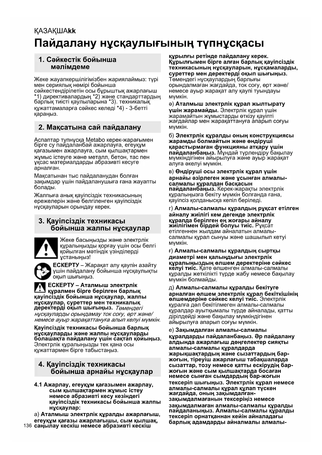 қауіпсіздік техникасы бойынша арнайы нұсқаулар: а) Тек электрлік құрал үшін мақұлданған абразивті құралдарды және тиісті абразивті құралға арналған қорғаныш қалпақты пайдаланыңыз. Электрлік құралға арналмаған абразивті құралдарды жеткілікті түрде жабу мүмкін болмайды және олар қауіпті болып